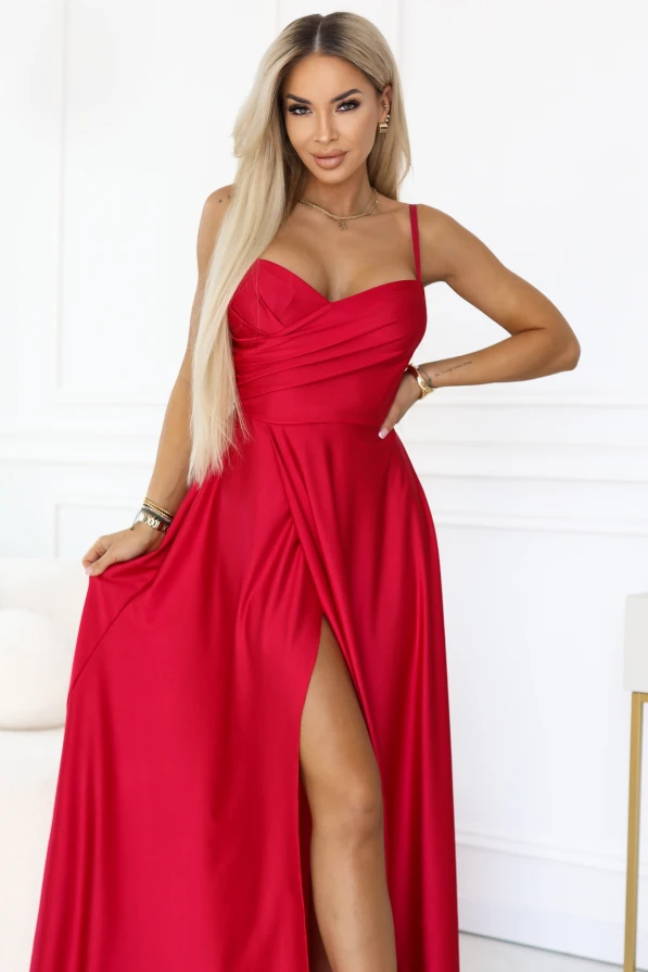 Ez a Numoco fekete maxi ruha igazi „esti magabiztosságot” ad viselőjének. A fazon letisztult, mégis minden részletében kifinomult: a lágyan omló anyag szépen követi a test vonalát, a derékvonal hangsúlyos, a mellrészen megerősített kosarak pedig biztos tartást és elegáns formát adnak. A hosszanti slicc minden lépésnél könnyedséget kölcsönöz, így a ruha egyszerre nőies, látványos és kényelmes.
