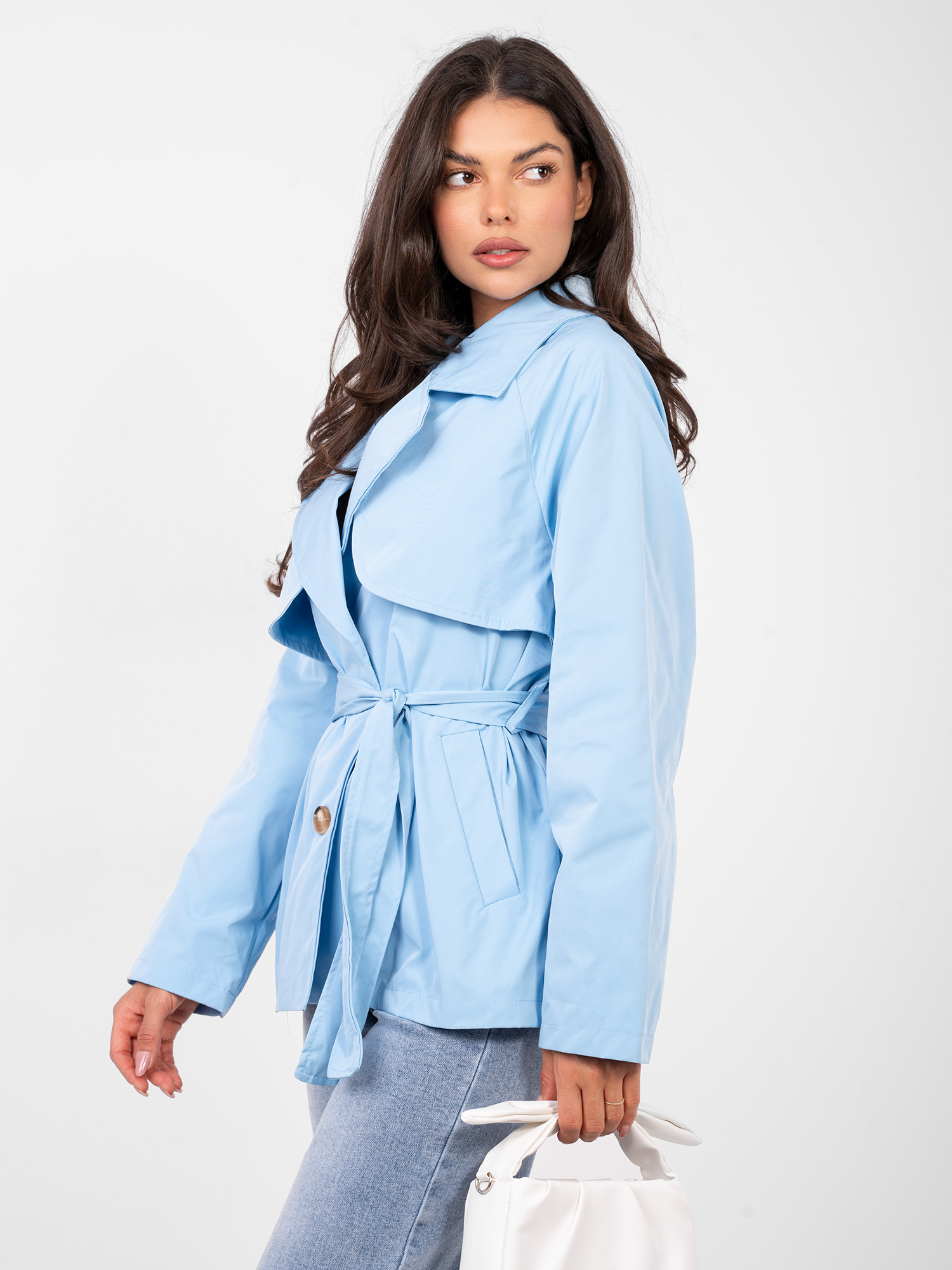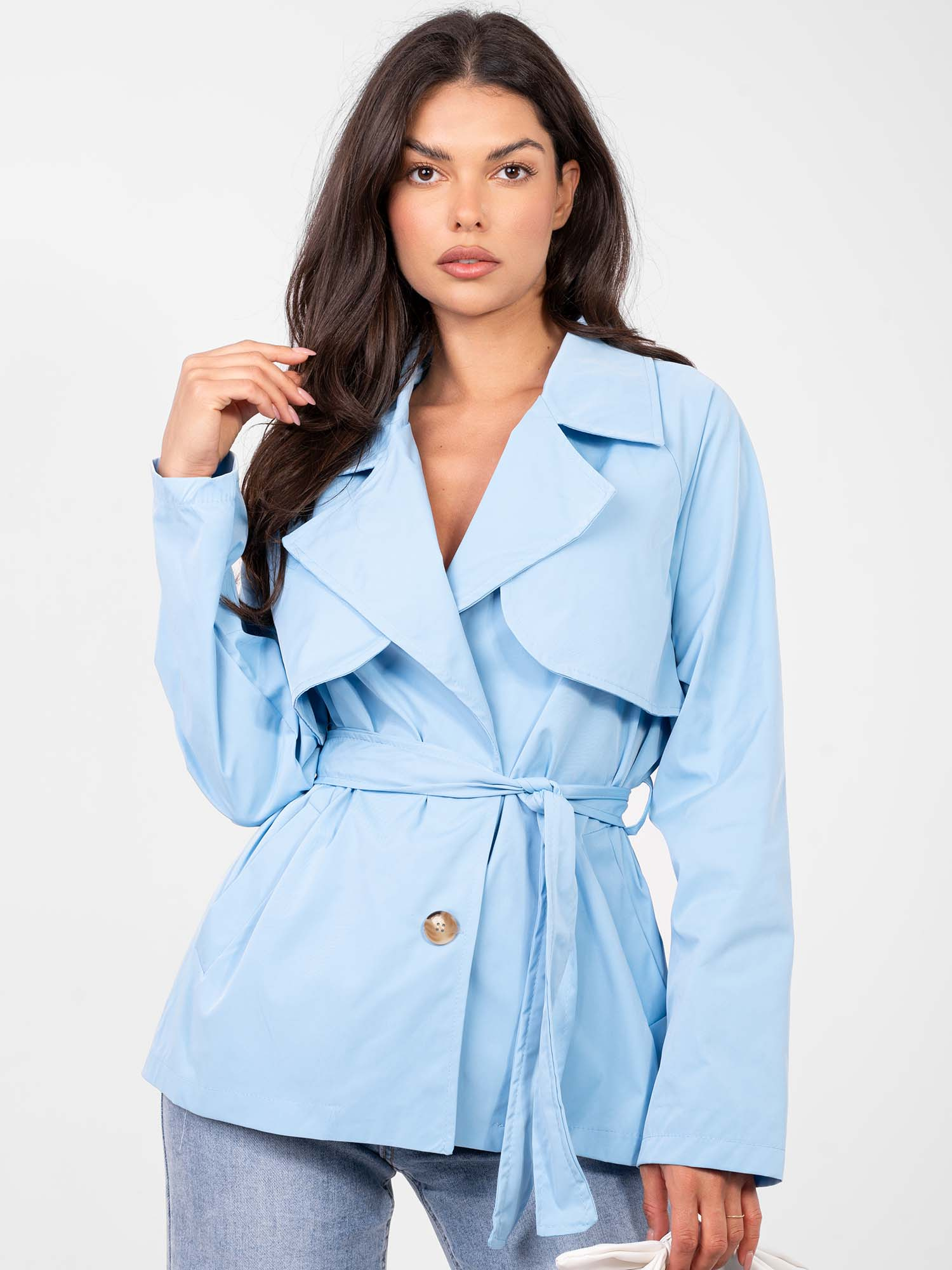 Ez a rövid fazonú, átmeneti kabát stílusos és praktikus választás a mindennapokra és munkába egyaránt. A letisztult, egyszínű kialakítás időtálló megjelenést biztosít, amely könnyen kombinálható különböző szettekkel. Az egysoros gombolás és a deréknál megköthető öv nőies sziluettet formál, miközben lehetőséget ad az egyéni illeszkedésre. A hosszú ujjak és a könnyű, béleletlen kialakítás ideálissá teszik az őszi, tavaszi és enyhébb téli időszakokra. Az oldalzsebek praktikus részletként növelik a kabát funkcionalitását.