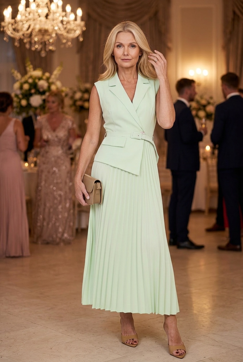 A Rue Paris elegáns midi ruhája kifinomult választás, ha nőies, mégis karakteres megjelenésre vágysz. A finoman bővülő, harang szabás szépen követi a test vonalát, miközben könnyed esést biztosít. Az ujjatlan kialakítást a galléros nyakrész teszi különlegessé, amely elegáns, rendezett összhatást ad a ruhának. A gombos záródás és a deréknál elhelyezett öv tovább hangsúlyozza a sziluettet, míg a diszkréten megjelenő flitteres részletek finom csillogást visznek az összképbe. Ideális választás munkahelyi megjelenéshez, alkalmi eseményekre vagy akár egy elegáns esti programhoz is.