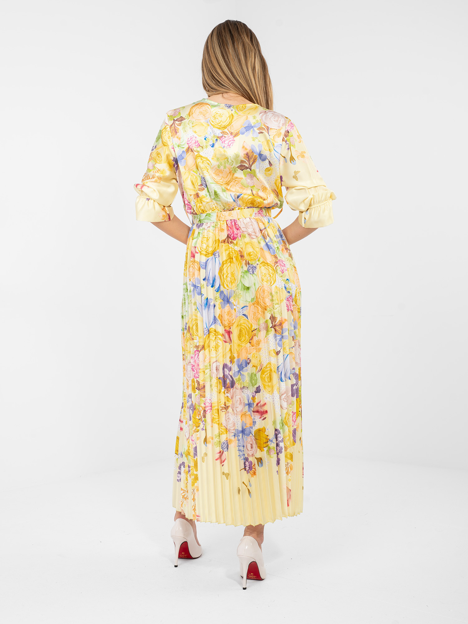 Ez a  tavaszi maxi hosszúságú ruha nőies és könnyed megjelenést biztosít, amely tökéletes választás a hétköznapokra, munkába vagy akár alkalmi eseményekre is. A virágmintás kialakítás friss, romantikus hangulatot ad, míg a kopertás nyakkivágás szépen hangsúlyozza a felsőtestet és karcsúsító hatást kelt. Az enyhén bővülő fazon és a deréknál megkötős öv harmonikus sziluettet formál. A háromnegyedes ujjak kényelmesek és elegáns megjelenést biztosítanak, a maxi hossz pedig légies esést ad a ruhának.