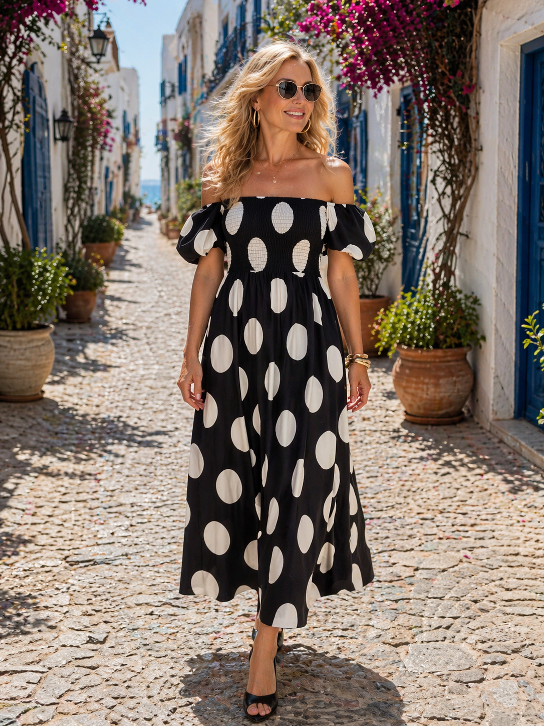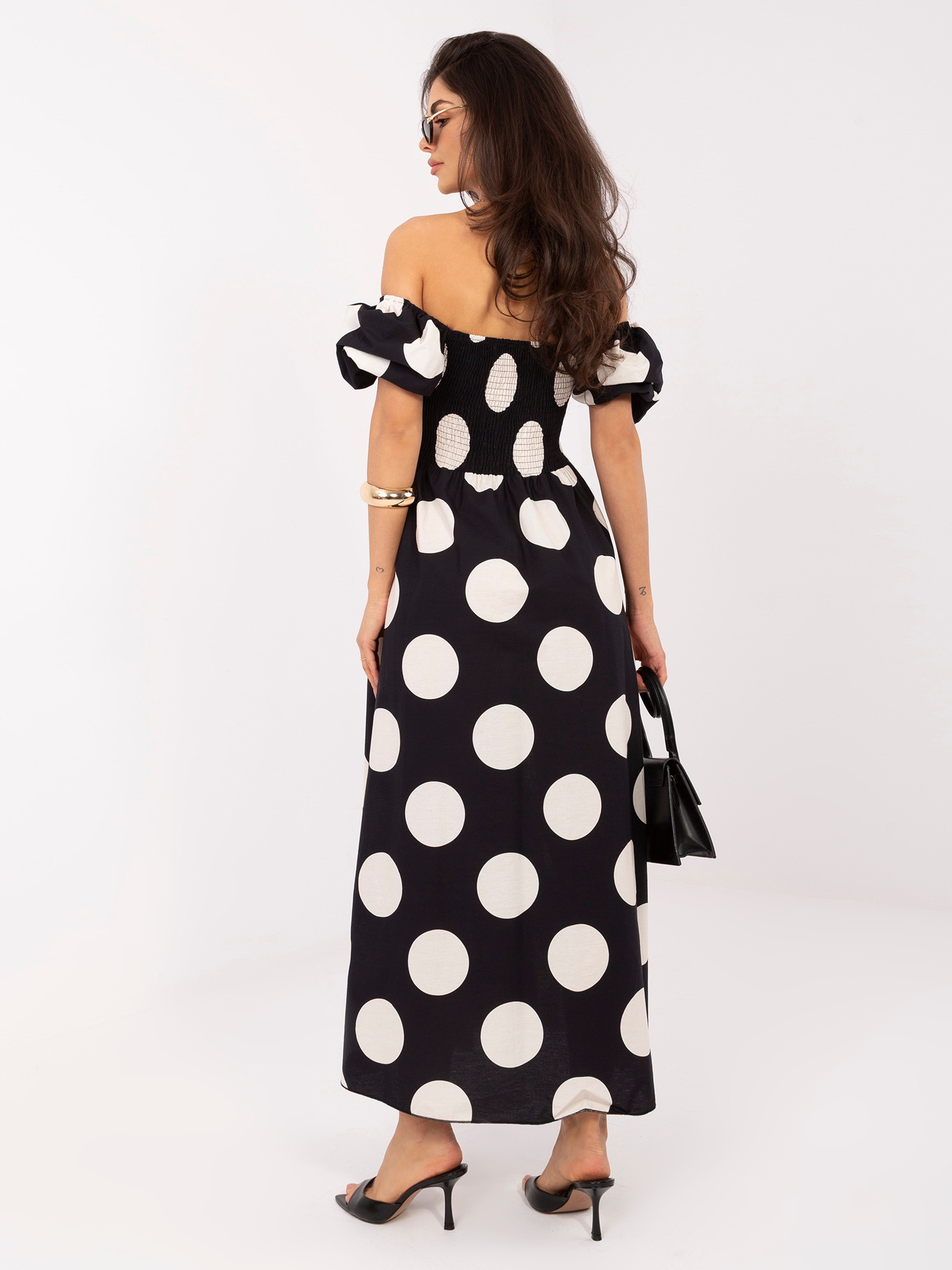 A spanyol nyakmegoldás finoman kiemeli a vállakat és a dekoltázst, így könnyed, nyárias hatást kelt. A rövid, puffos ujjak és a ráncolt részletek játékos, mégis kifinomult karaktert adnak a ruhának, míg a pöttyös minta időtálló és nőies megjelenést biztosít. A könnyű pamut anyag kényelmes viseletet nyújt, így ideális választás melegebb napokra is.