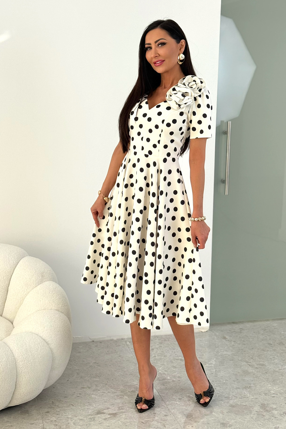 A rövid ujjú kialakítás és a nőies dekoltázs elegáns, mégis könnyed megjelenést ad. A ruha különleges részlete a levehető, térhatású díszvirág, amely egyedi karaktert kölcsönöz a modellnek, és alkalomtól függően variálható.