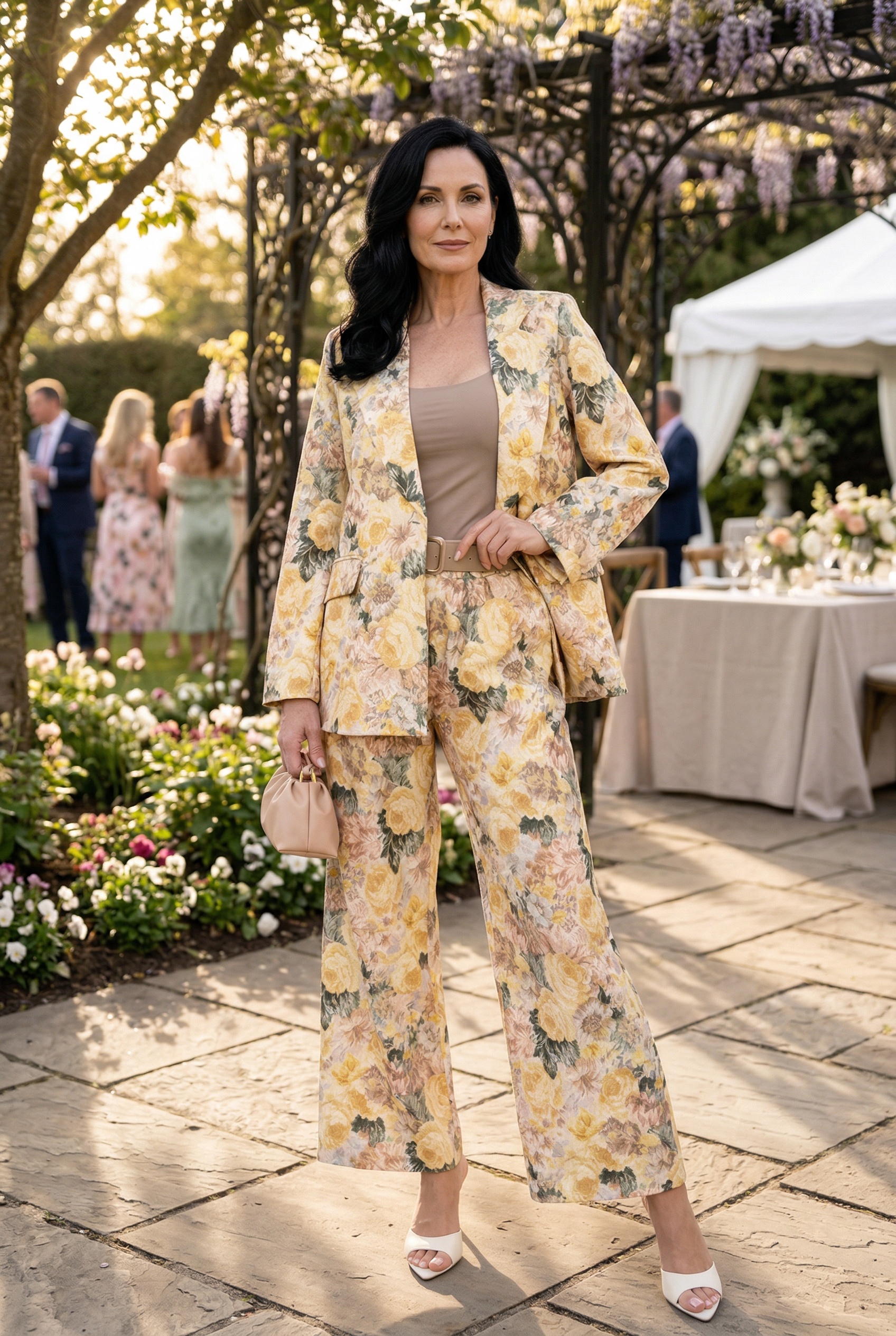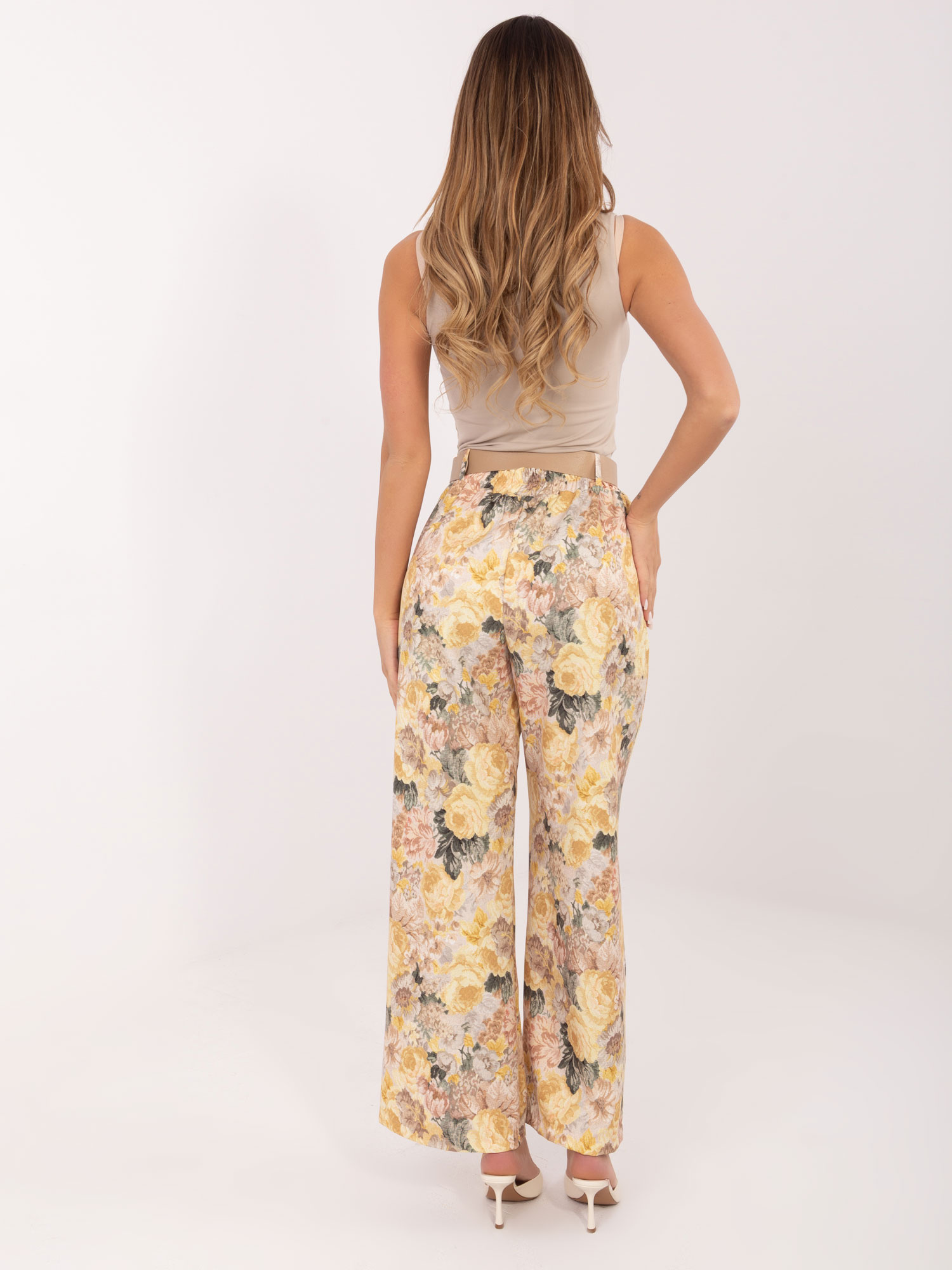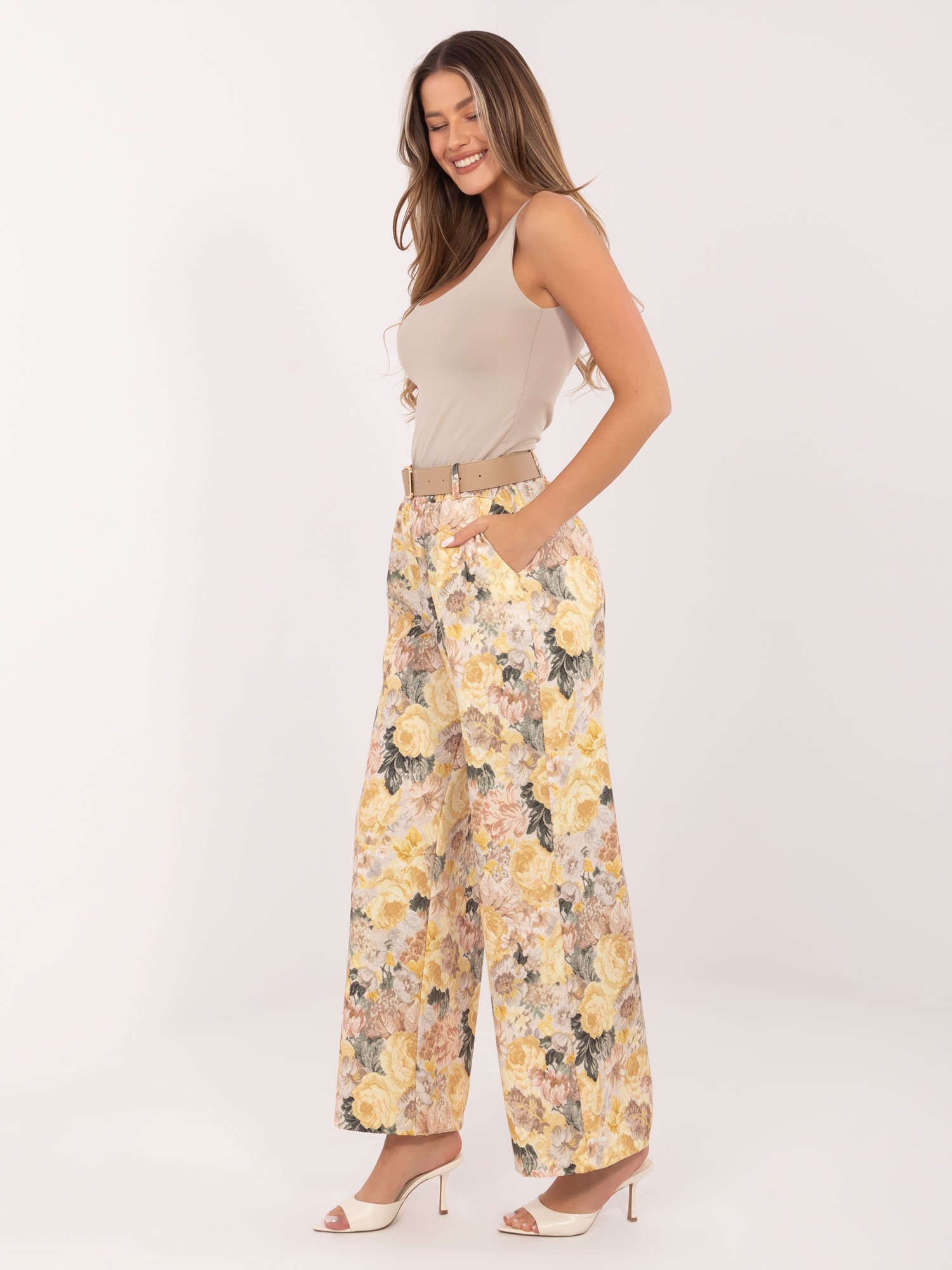 A Rue Paris virágmintás széles szárú nadrág légies eleganciát és kényelmes viseletet kínál a mindennapokra. A magas derekú kialakítás szépen hangsúlyozza az alakot, míg a bő szárú fazon könnyed mozgást és modern megjelenést biztosít. A virágos minta nőies, friss hatást kelt, amit az anyag lágy esése még inkább kiemel. Derékrészen övvel készült, így könnyen igazítható, az oldalsó zsebek pedig praktikus részletként egészítik ki ezt a stílusos darabot. Tökéletes választás, ha egyszerre keresel kényelmes és elegáns nadrágot, amely kifinomultan illeszkedik a gardróbodba.