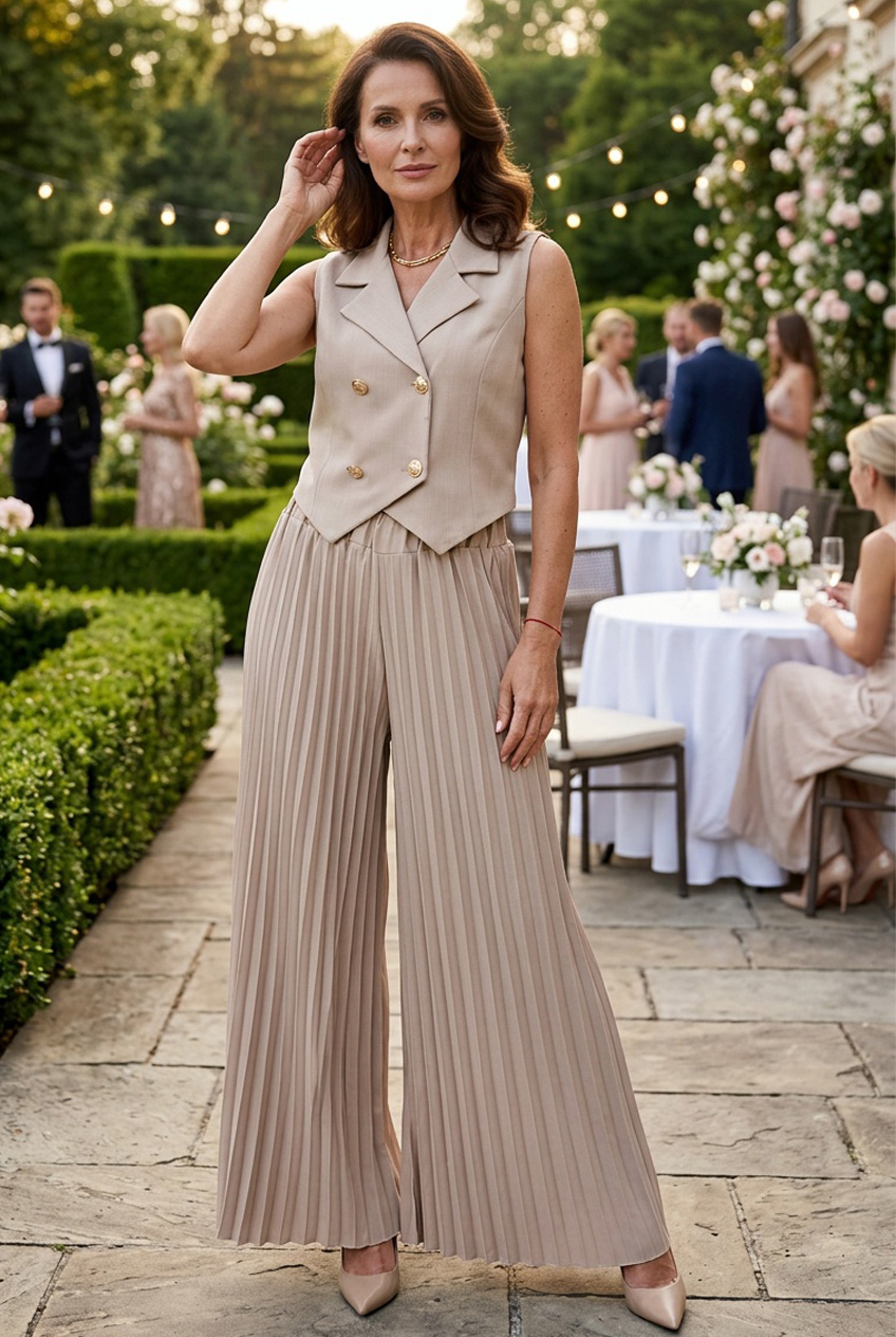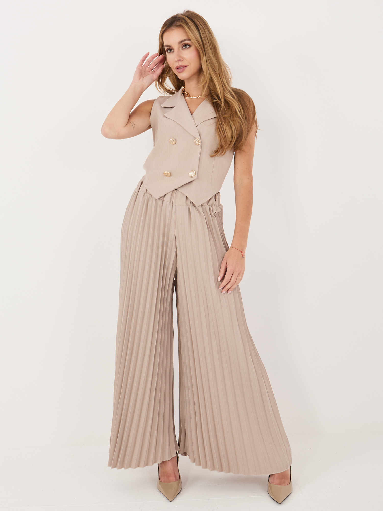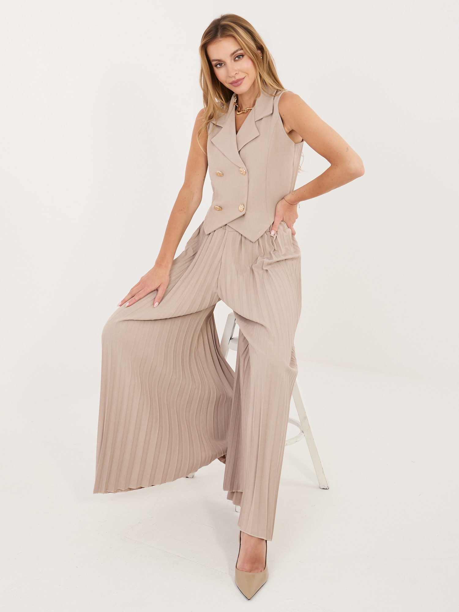 Az Italy Moda mellény és nadrág szettje modern eleganciát és letisztult nőiességet képvisel, amely tökéletes választás a mindennapokra, munkába vagy akár alkalmi eseményekre is. Az ujjatlan, galléros mellény dupla gombsoros kialakítása karakteres, mégis kifinomult megjelenést ad, miközben szépen kiemeli a felsőtest vonalát. A hozzá illő nadrág harmonikusan egészíti ki az összhatást, letisztult szabásával és kényelmes viseletével egyaránt stílusos és praktikus darab. Ez a szett magabiztos, ápolt megjelenést biztosít, és könnyedén beilleszthető egy elegáns, modern gardróbba.