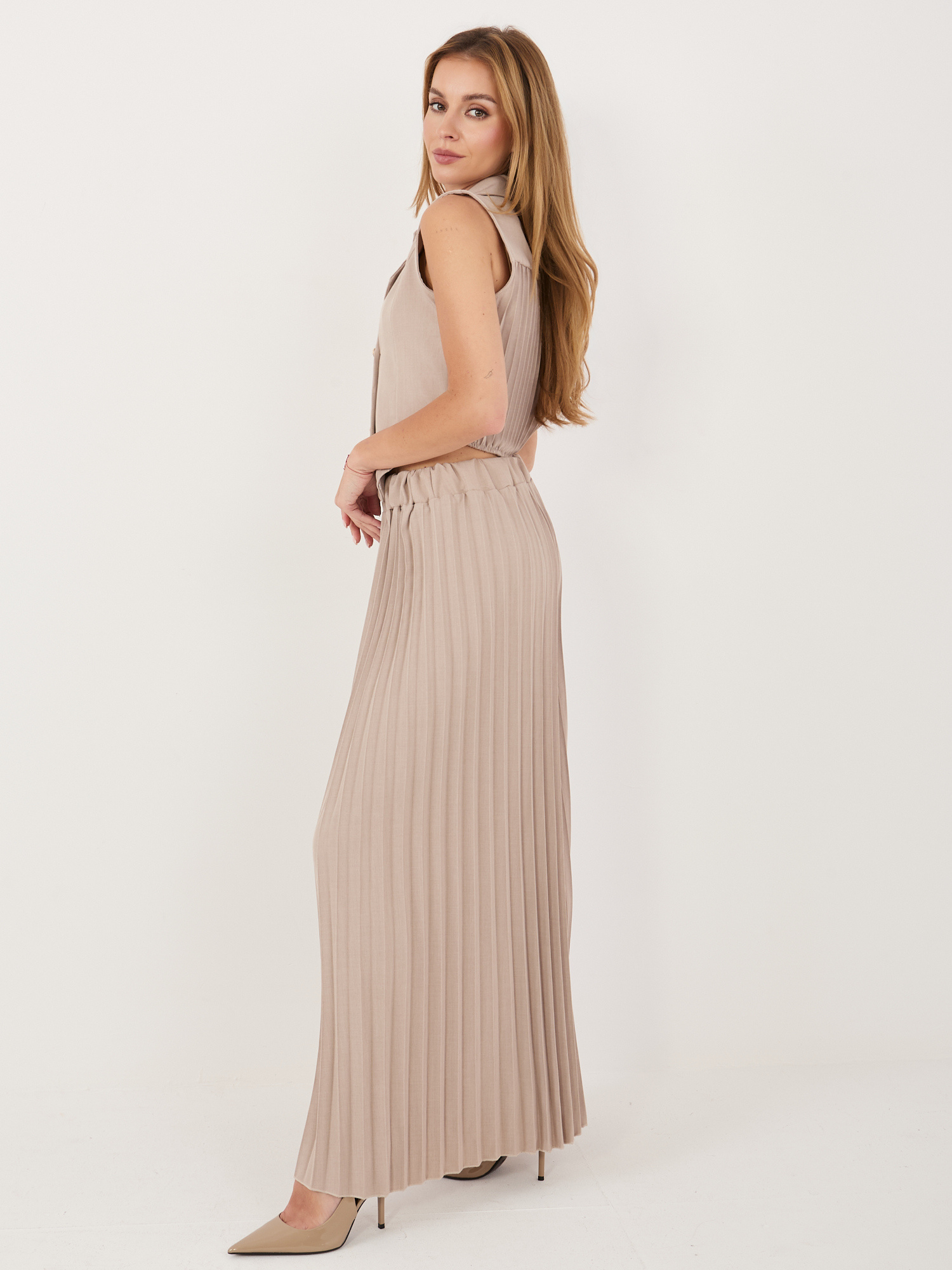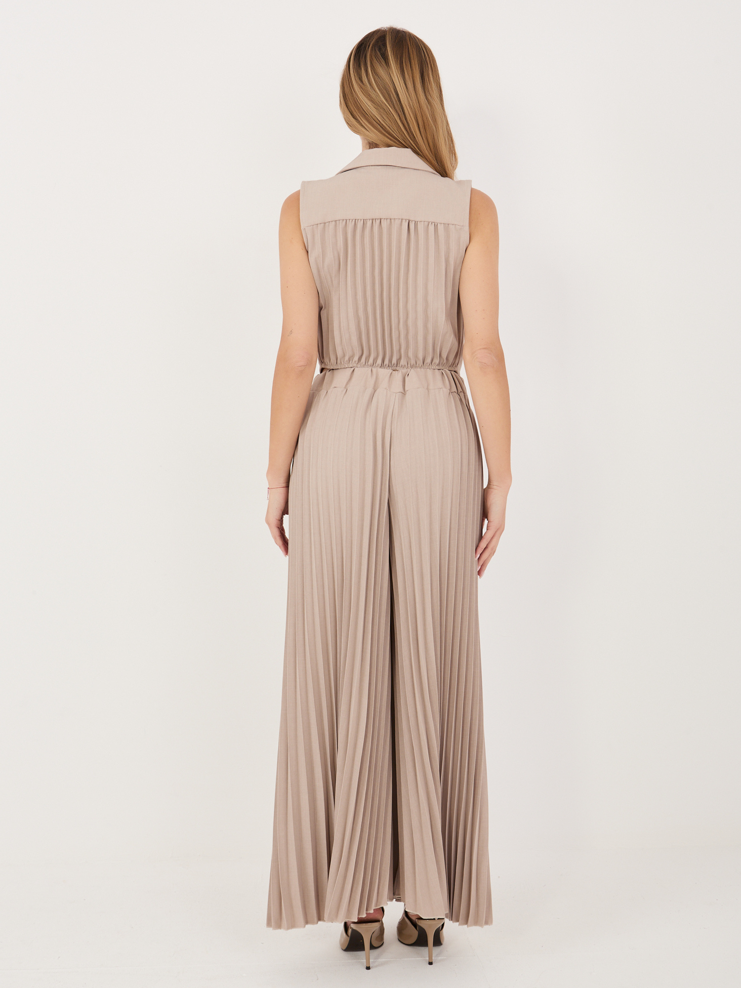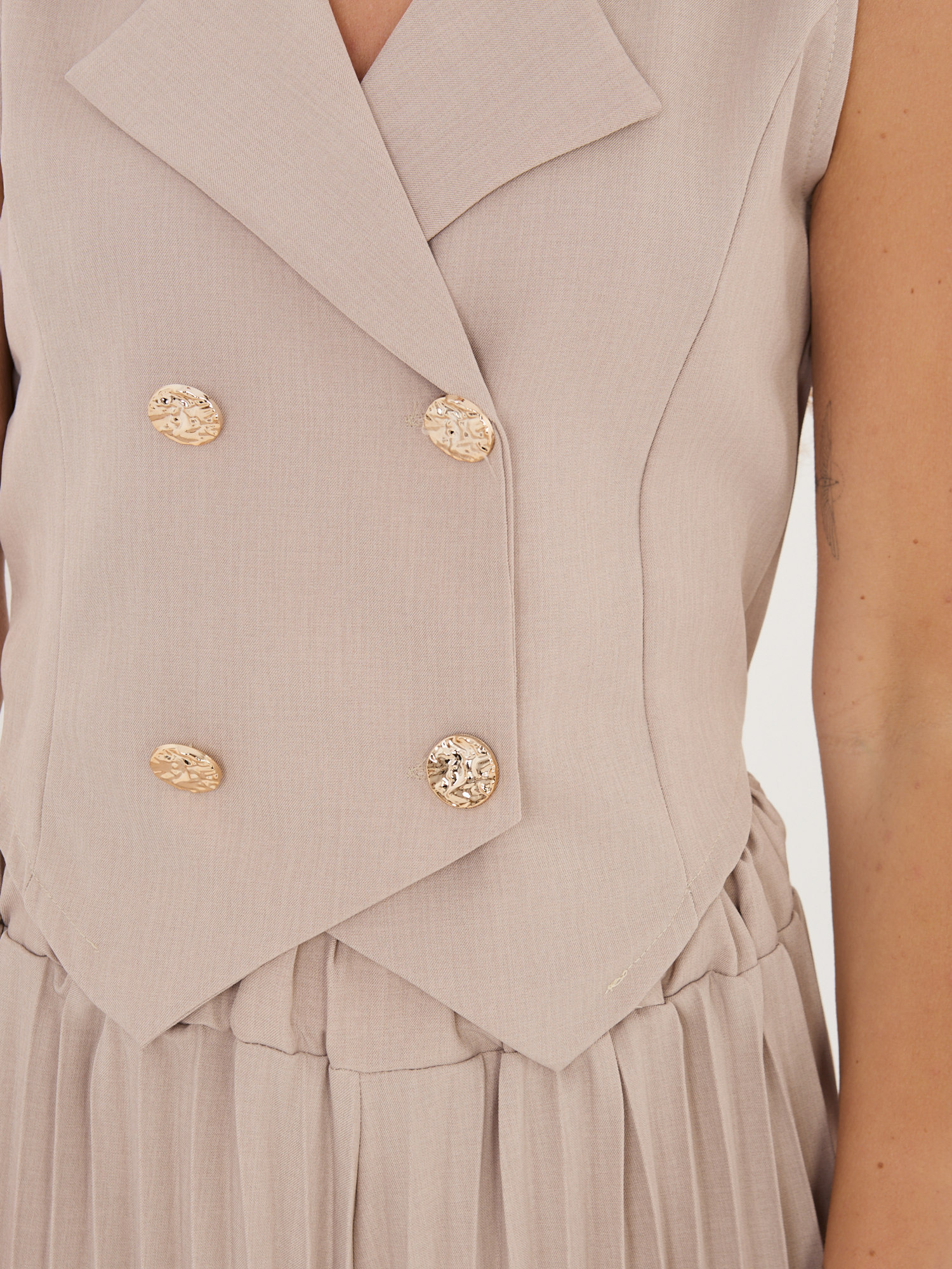 Az Italy Moda mellény és nadrág szettje modern eleganciát és letisztult nőiességet képvisel, amely tökéletes választás a mindennapokra, munkába vagy akár alkalmi eseményekre is. Az ujjatlan, galléros mellény dupla gombsoros kialakítása karakteres, mégis kifinomult megjelenést ad, miközben szépen kiemeli a felsőtest vonalát. A hozzá illő nadrág harmonikusan egészíti ki az összhatást, letisztult szabásával és kényelmes viseletével egyaránt stílusos és praktikus darab. Ez a szett magabiztos, ápolt megjelenést biztosít, és könnyedén beilleszthető egy elegáns, modern gardróbba.