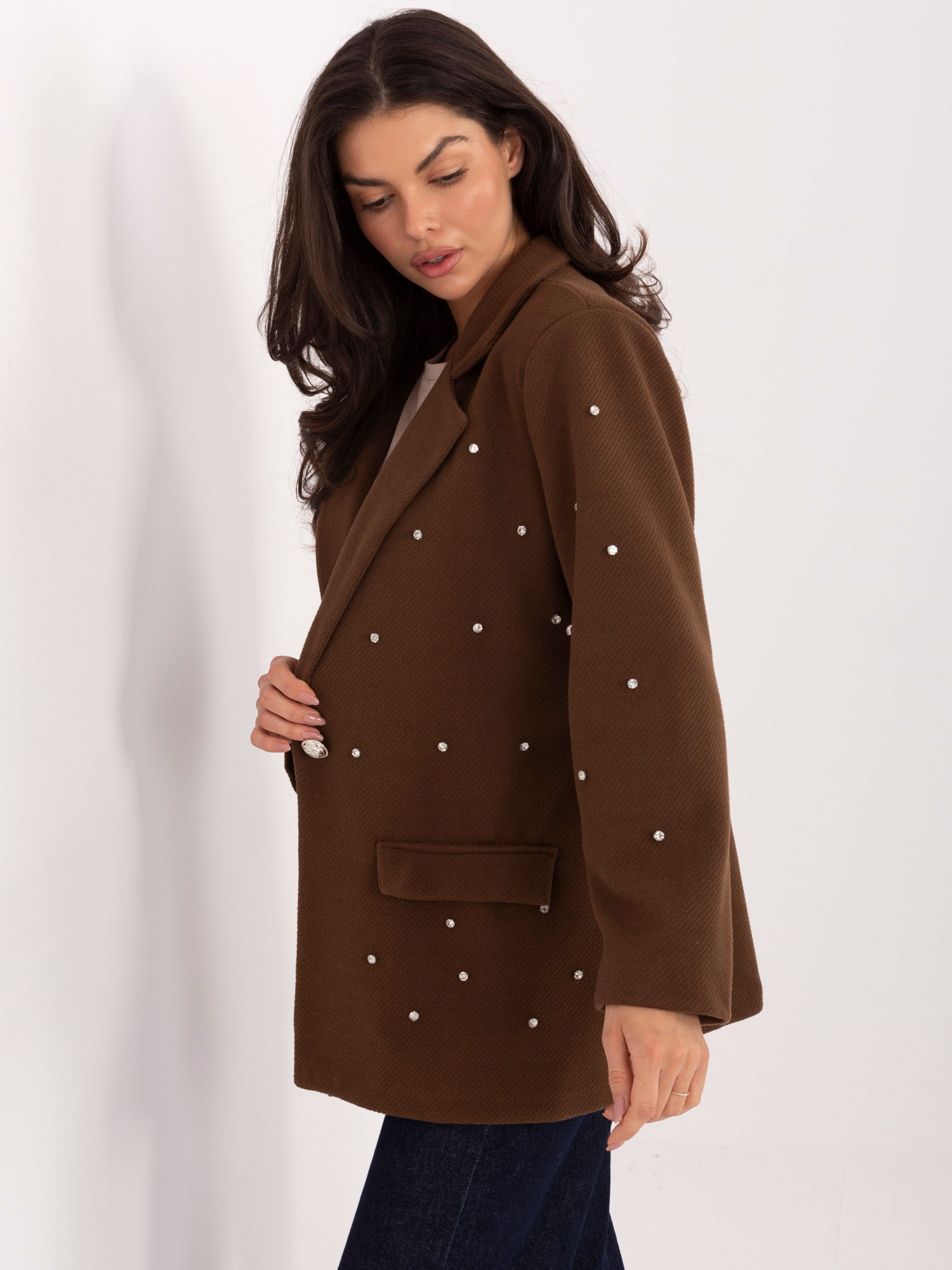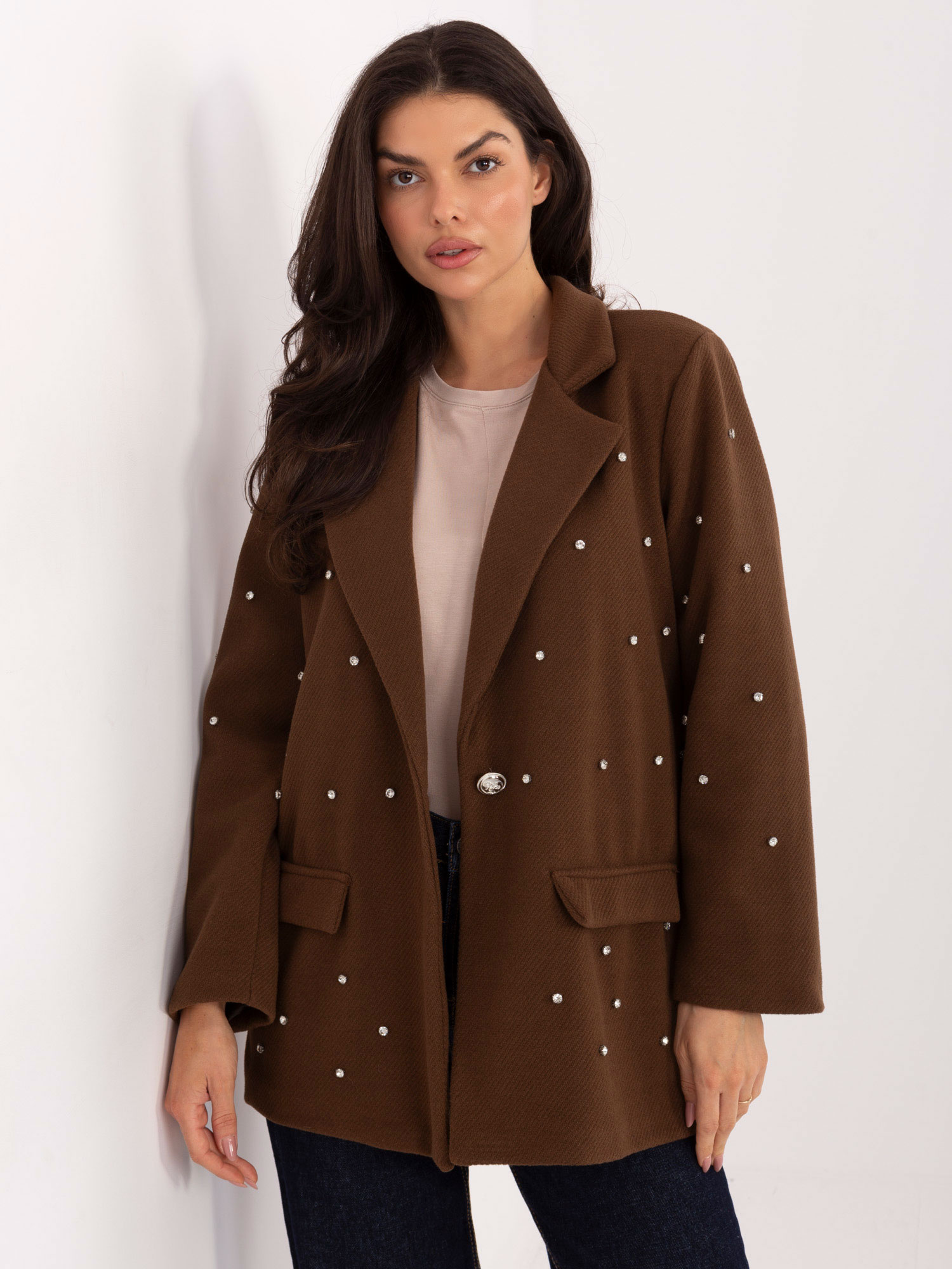 A látványos cirkóniadíszítés és az egygombos, letisztult záródás nőies, elegáns karaktert ad a darabnak. A puha poliészter–viszkóz keverék szép tartást ad a zakónak, ugyanakkor kellemes érzetet nyújt viselés közben. Kapucni nélkül készült, így kifinomultabb, klasszikus hatást kelt, bármilyen alkalmi vagy elegáns összeállítás tökéletes kiegészítője lehet.