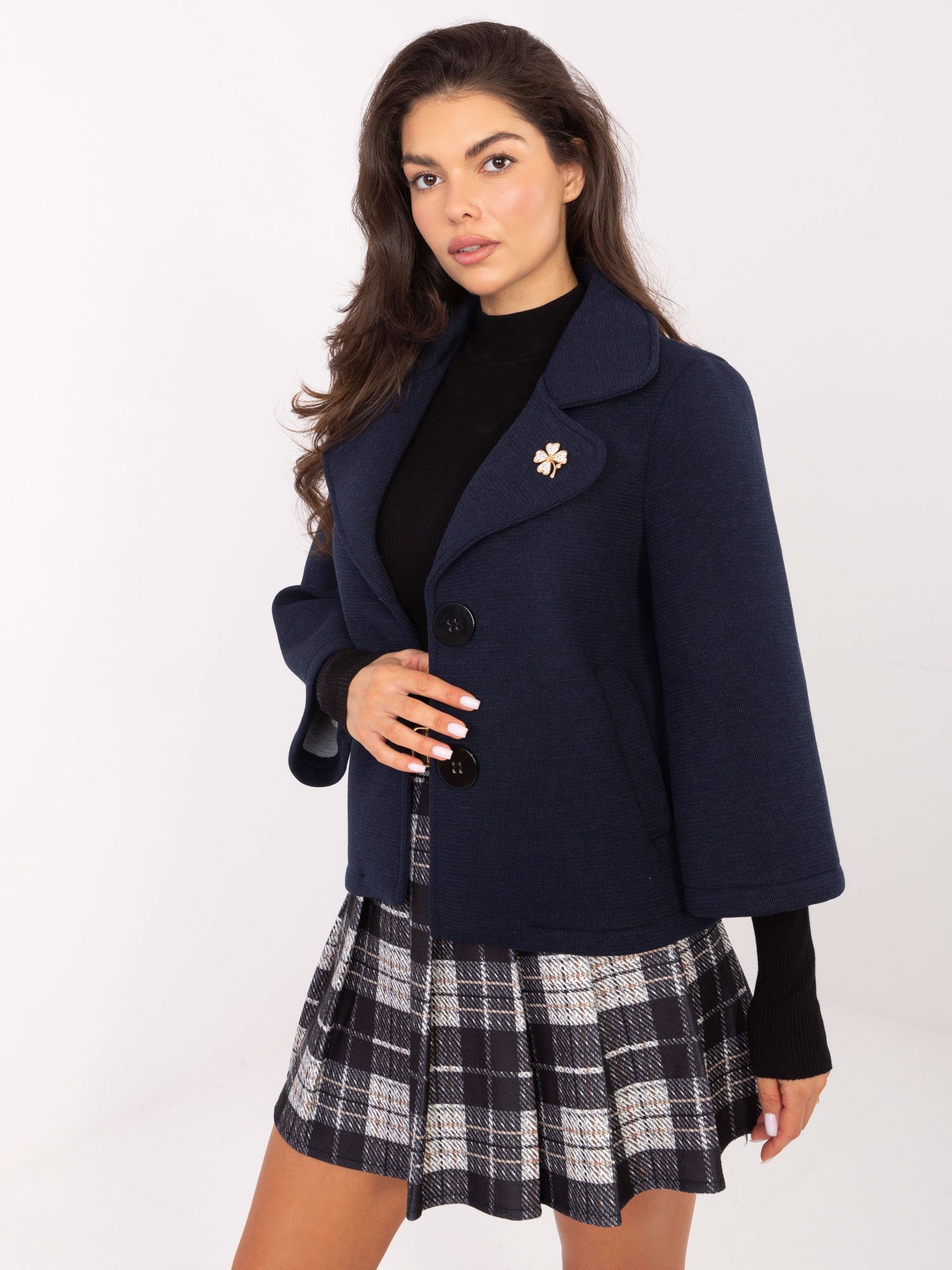 A fazont az egygombos záródás és a mellé díszítésként helyezett elegáns bross teszi még különlegesebbé. A tágas oldalzsebek praktikussá és hétköznapokon is könnyen viselhetővé teszik. A kapucni nélküli kialakítás letisztult, elegáns sziluettet biztosít, így akár munkába, akár elegáns alkalmakra is tökéletes választás.