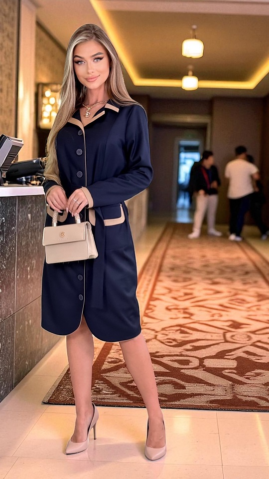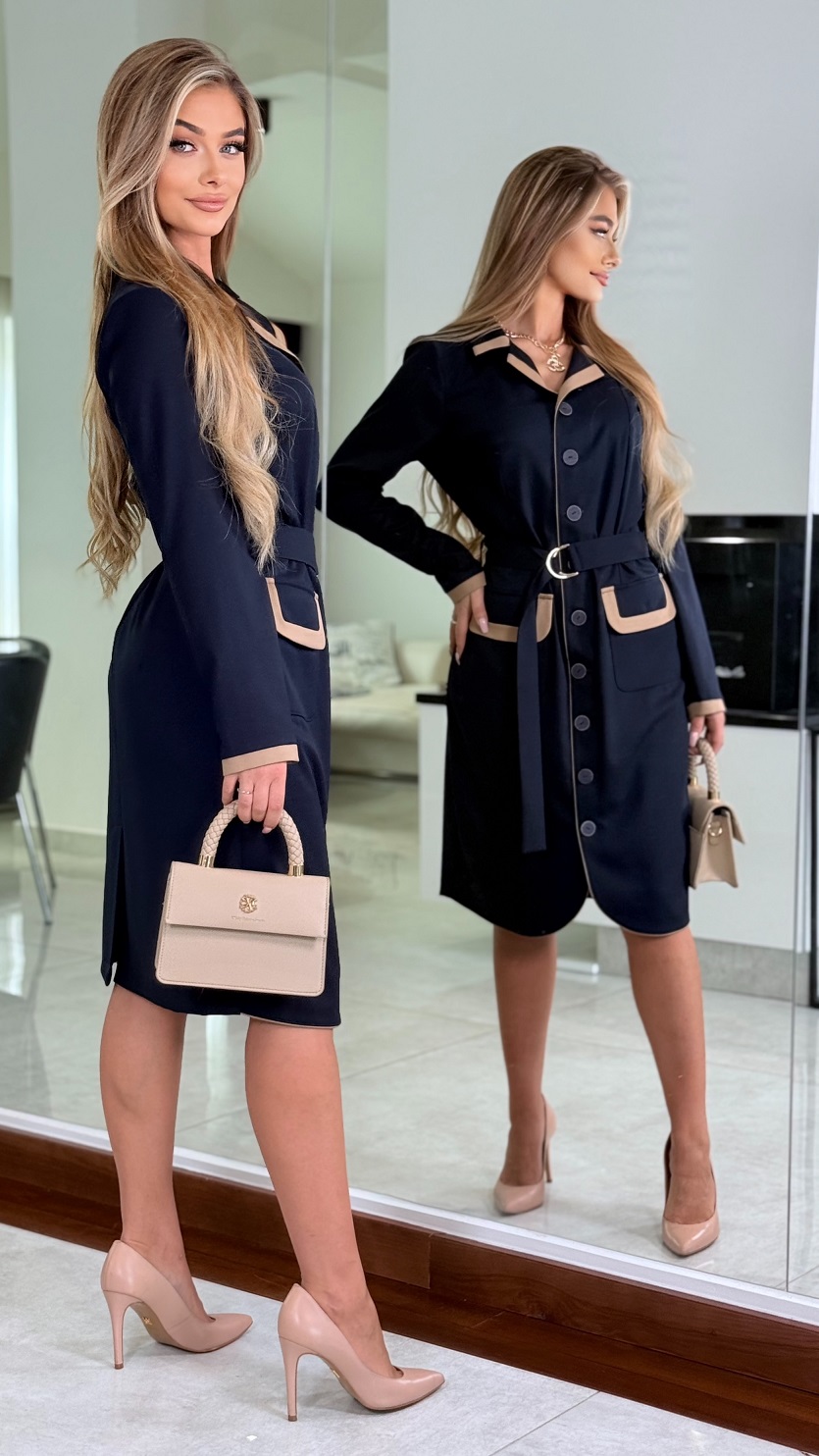 Divatos irodai ruha: modern ruha őszi viszkóz anyagból, négy egyszínű kivitelben. A ruhát díszes öv és modern, zsebfedős elülső zsebek egészítik ki, boríték fazonú gallérral. Az eleje díszgombokkal záródik.