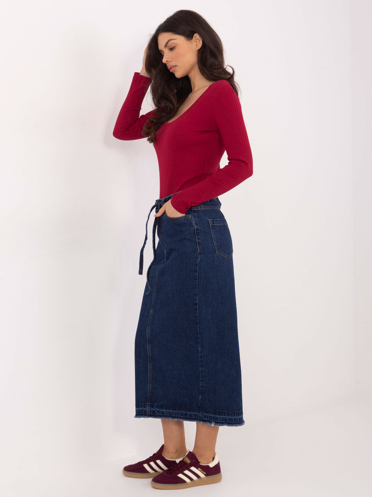 A SUBLEVEL elegáns, mégis kényelmes midi szoknyája tökéletes választás a mindennapokra és az irodába egyaránt. A letisztult, egyszínű fazon időtálló, a puha 100% pamut anyag pedig kellemes viseletet biztosít egész nap. A magas derékrész szépen formálja az alakot, a lefelé enyhén bővülő szabás pedig természetes mozgást enged. A gombos és cipzáras záródás klasszikus, nőies megjelenést kölcsönöz, míg a hozzá tartozó öv tovább hangsúlyozza a derekat. A fazon egyszerre praktikus és elegáns – sokféle felsővel kombinálható, így könnyedén beilleszthető egy nőies, letisztult ruhatárba.