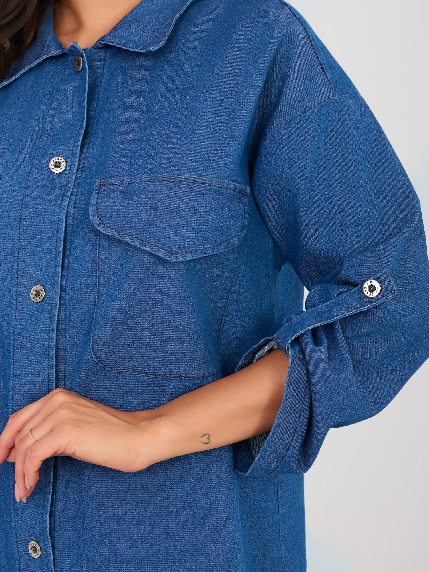 Ez a farmer anyagból készült, ingruha fazonú ruha laza, mégis nőies megjelenést kínál a mindennapokra. Az aszimmetrikus szabás modern karaktert ad a darabnak, miközben a térd fölé érő hossz praktikus és jól hordható. A klasszikus galléros nyakkivágás és az elöl végig gombos kialakítás időtálló stílust képvisel, az oldalzsebek pedig kényelmes, praktikus részletként szolgálnak. A pamut alapanyag elasztánnal kiegészítve kellemes viseletet és jó mozgásszabadságot biztosít, így ez a ruha ideális választás hétköznapi programokra.