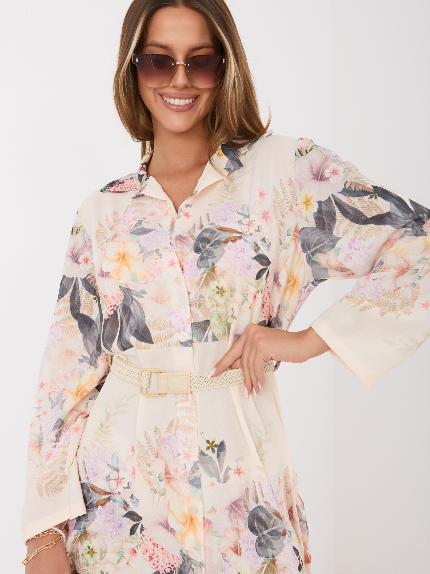 A ráncolások és a fodros részletek játékos, mégis kifinomult megjelenést kölcsönöznek, míg a deréknál elhelyezett öv segít kiemelni a sziluettet. A bélés biztosítja a kényelmes viseletet és a magabiztos megjelenést. A mintás felület friss és nőies hatást ad, így ez a ruha ideális választás egy stílusos hétköznapi összeállításhoz.