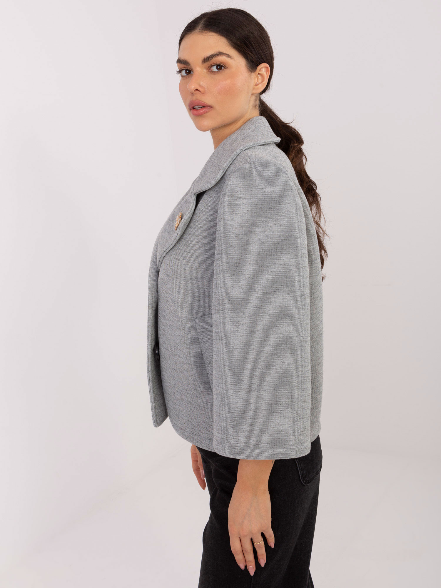 Szürke galléros kabát brossal