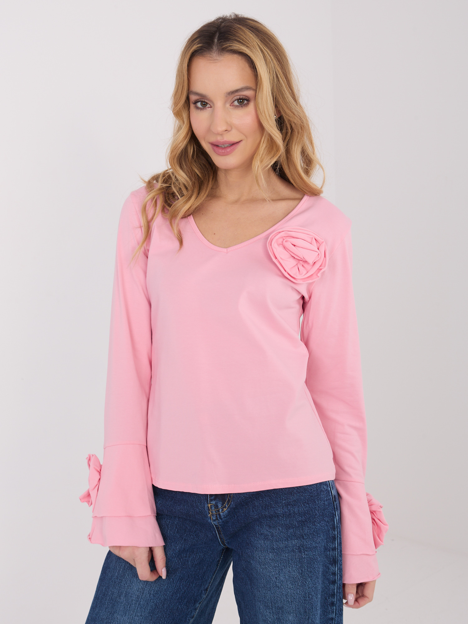Ez az elegáns, testhez simuló fazonú hosszú ujjú felső nőies és kifinomult megjelenést biztosít, így tökéletes választás a mindennapokra, munkába, alkalmi megjelenésekhez vagy akár esti programokra is. A V alakú nyakkivágás szépen hangsúlyozza a dekoltázst, miközben optikailag nyújtja a felsőtestet. A finoman kidolgozott fodros részlet különleges, mégis visszafogott díszítőelem, amely elegáns karaktert ad a blúznak. A standard hosszúság és a tiszta pamut anyag kényelmes, jól szellőző viseletet biztosít egész nap.