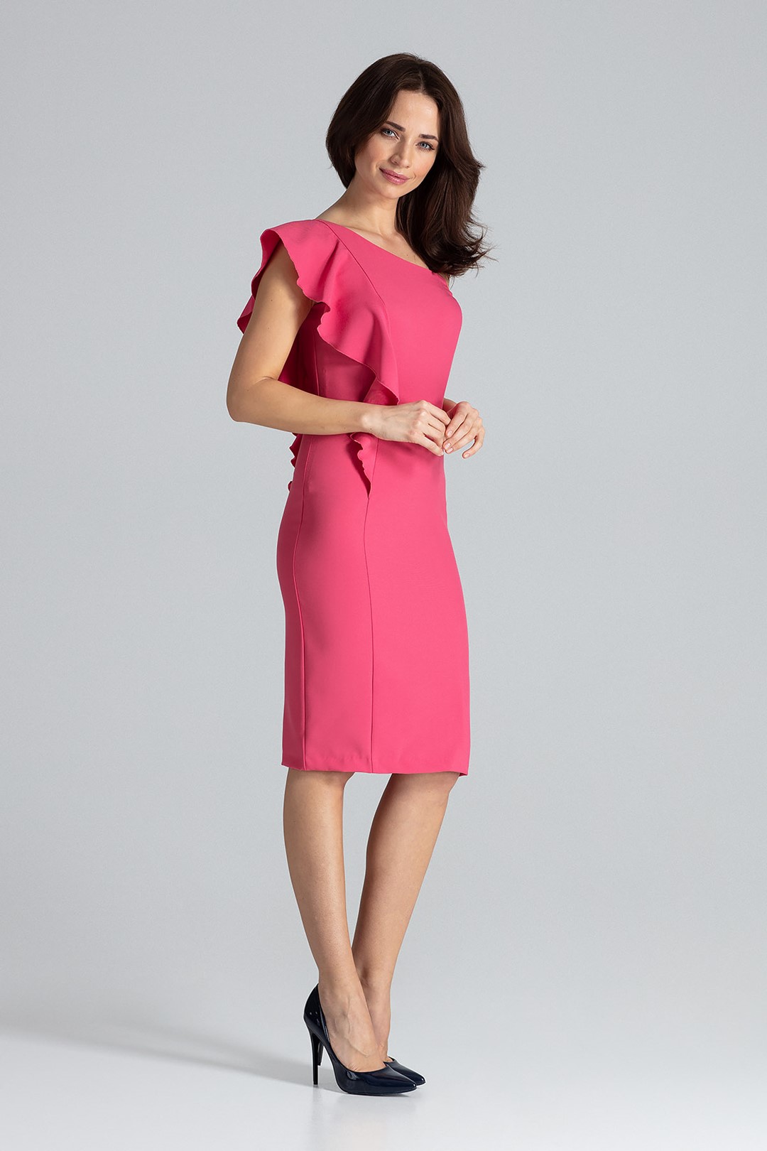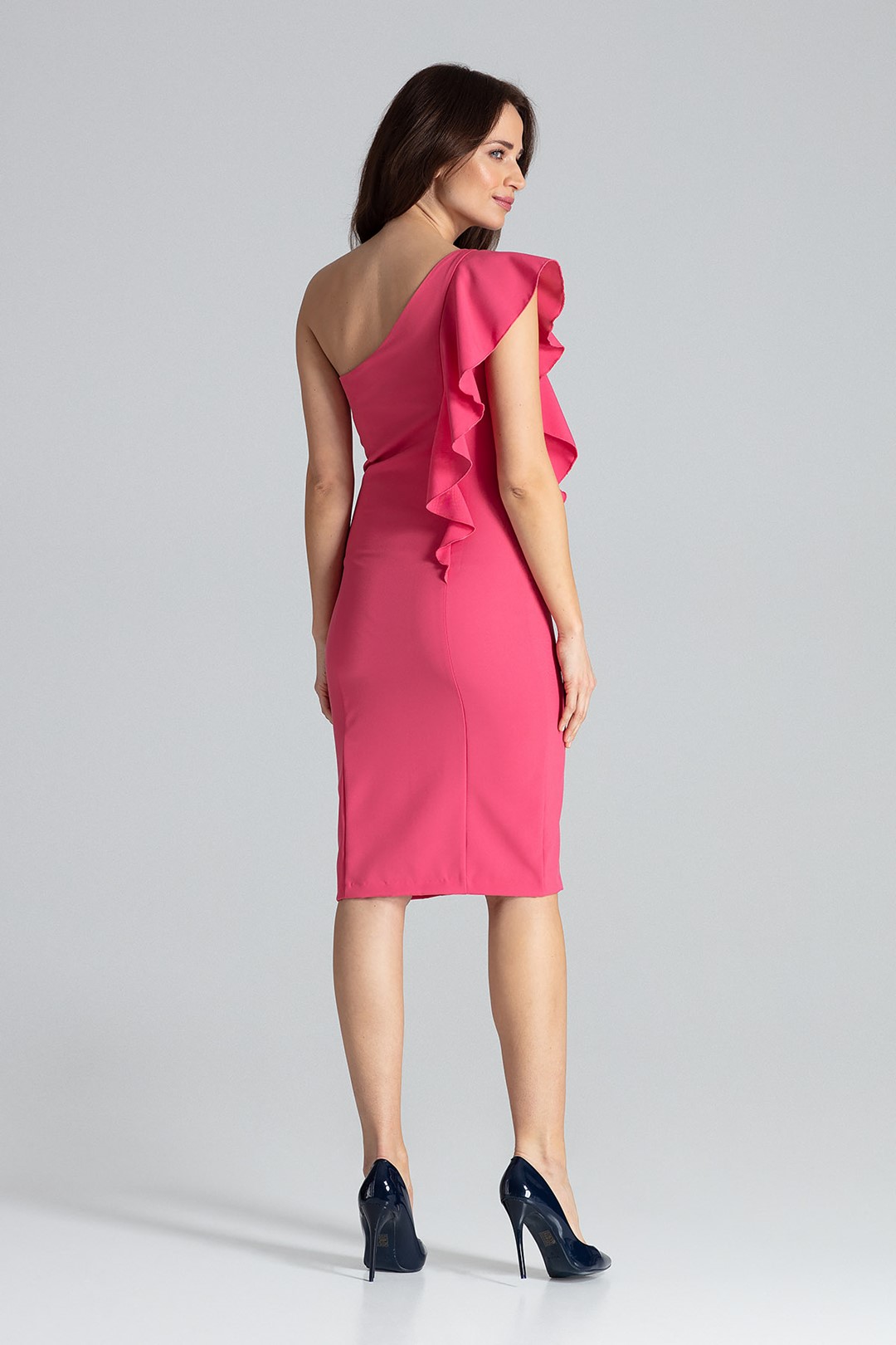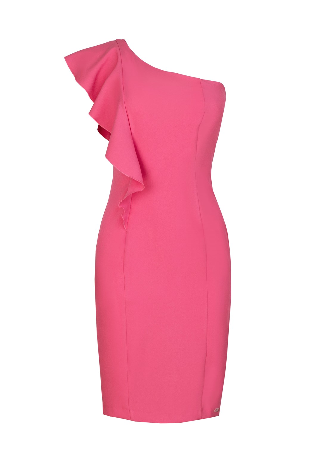 Ez az elegáns, egyvállas ruha különleges és modern megjelenést biztosít. A vállrészen elhelyezett látványos fodor nőies, karakteres részlet, amely finoman hangsúlyozza a felsőtestet. A letisztult, egyenes szabás kényelmes viseletet nyújt, miközben szépen kiemeli az alakot és elegáns sziluettet formál.