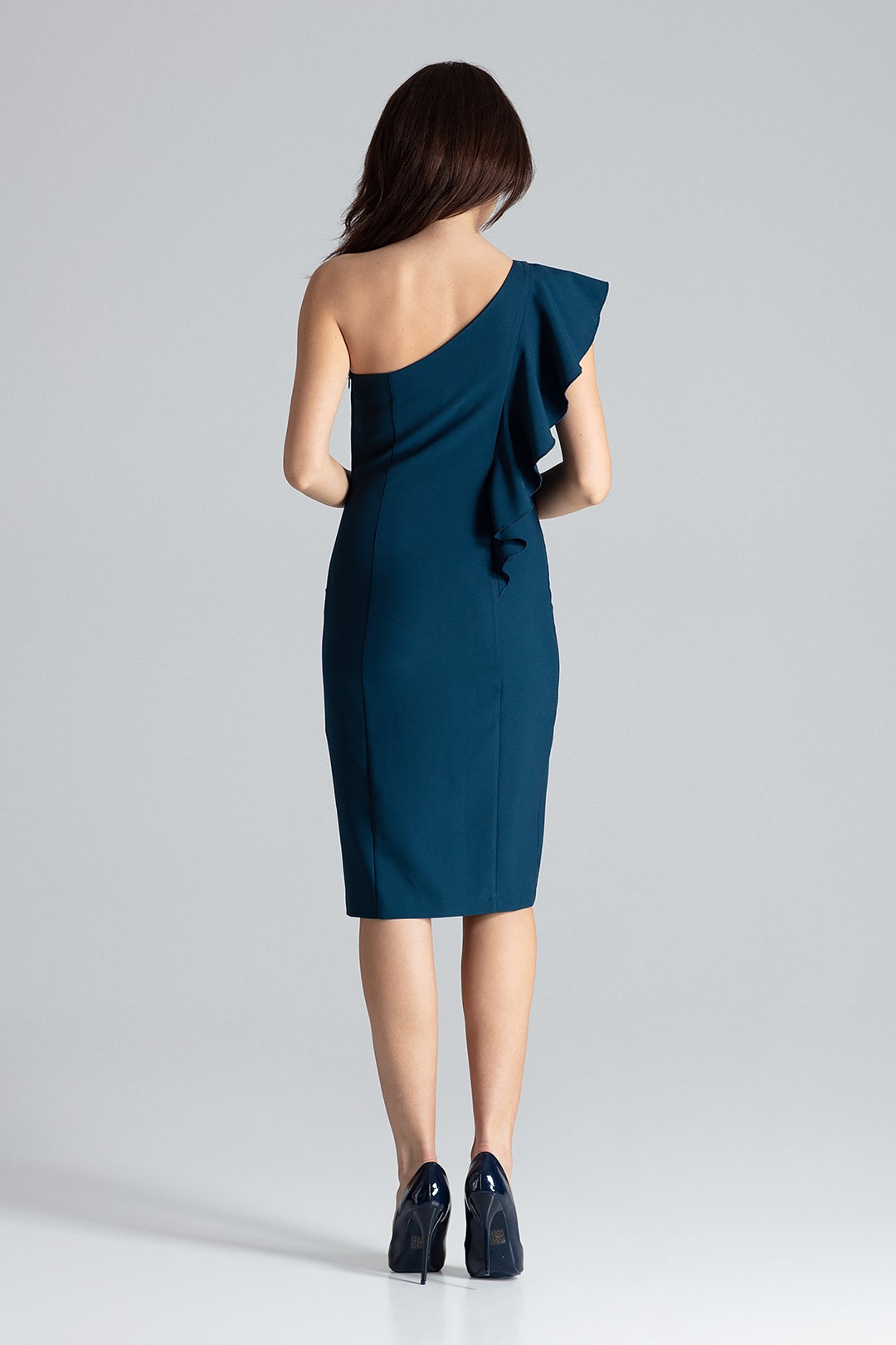 Ez az elegáns, egyvállas ruha különleges és modern megjelenést biztosít. A vállrészen elhelyezett látványos fodor nőies, karakteres részlet, amely finoman hangsúlyozza a felsőtestet. A letisztult, egyenes szabás kényelmes viseletet nyújt, miközben szépen kiemeli az alakot és elegáns sziluettet formál.