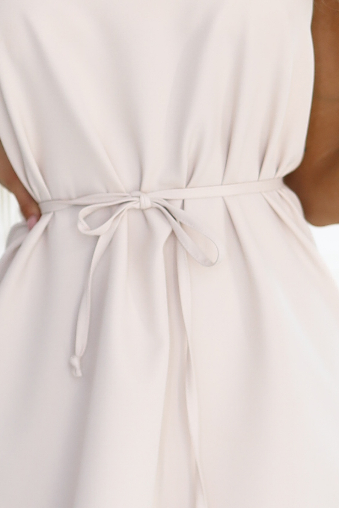 Ez a Numoco ruha letisztult eleganciát és kényelmes viseletet kínál, amely tökéletes választás a mindennapokra, munkahelyi megjelenéshez vagy akár alkalmi programokra is. A kerek nyakkivágás és az ujjatlan kialakítás szépen kiemeli a vállakat, miközben könnyed, nőies összhatást teremt. A deréknál elhelyezett megkötős öv lehetővé teszi a sziluett finom formálását, a bővülő, trapéz szabás pedig lágy esést és kényelmes mozgást biztosít. A térd fölé érő hossz praktikus és sokoldalúan viselhetővé teszi, így ez a darab könnyedén alkalmazkodik különböző alkalmakhoz.