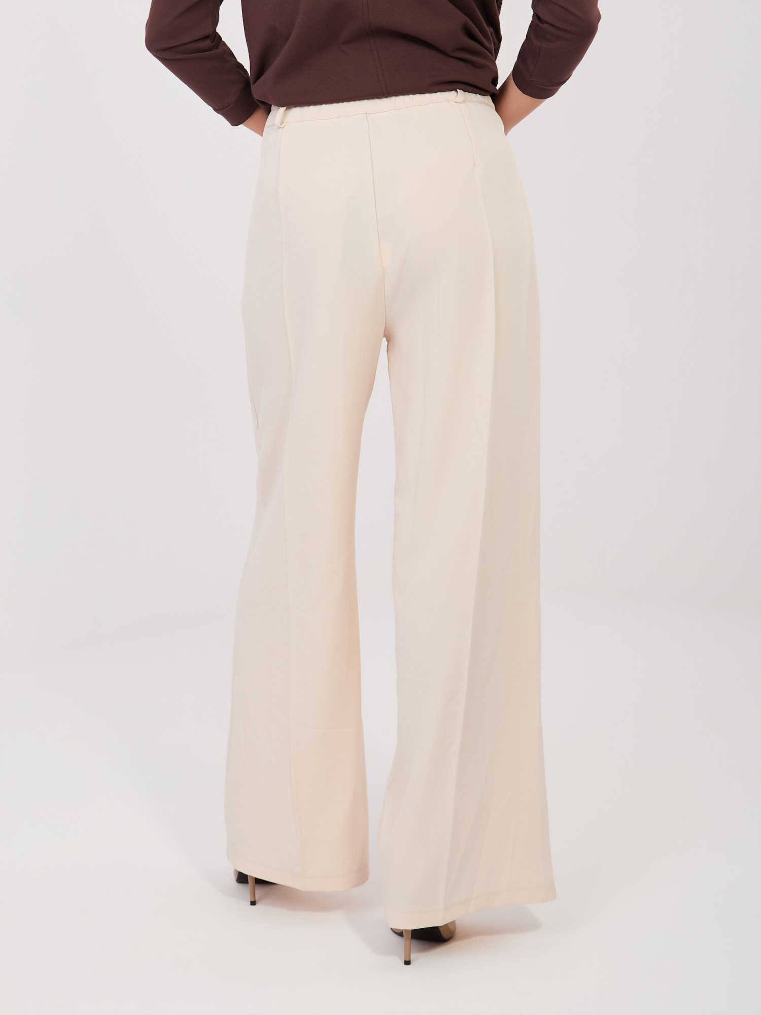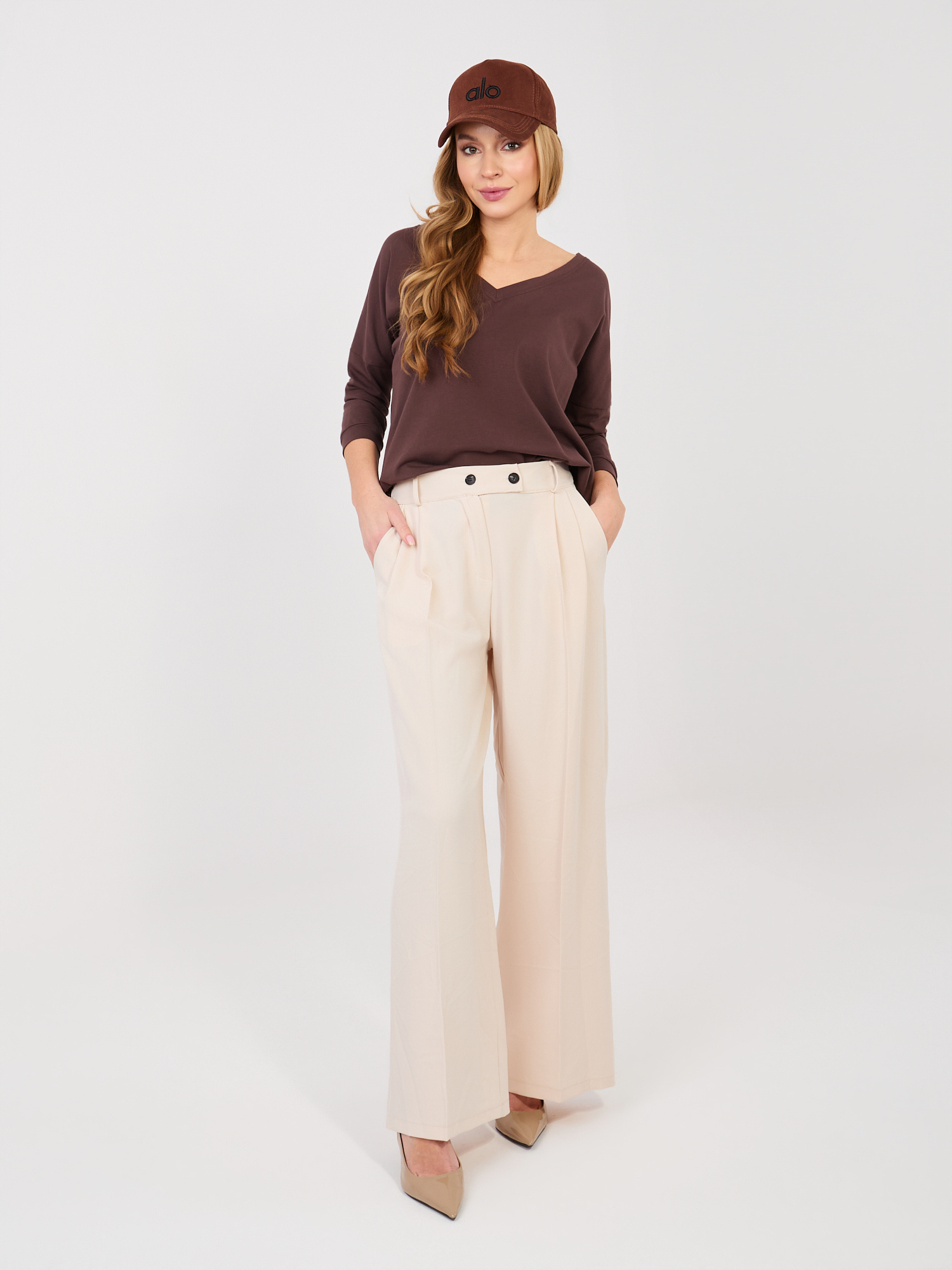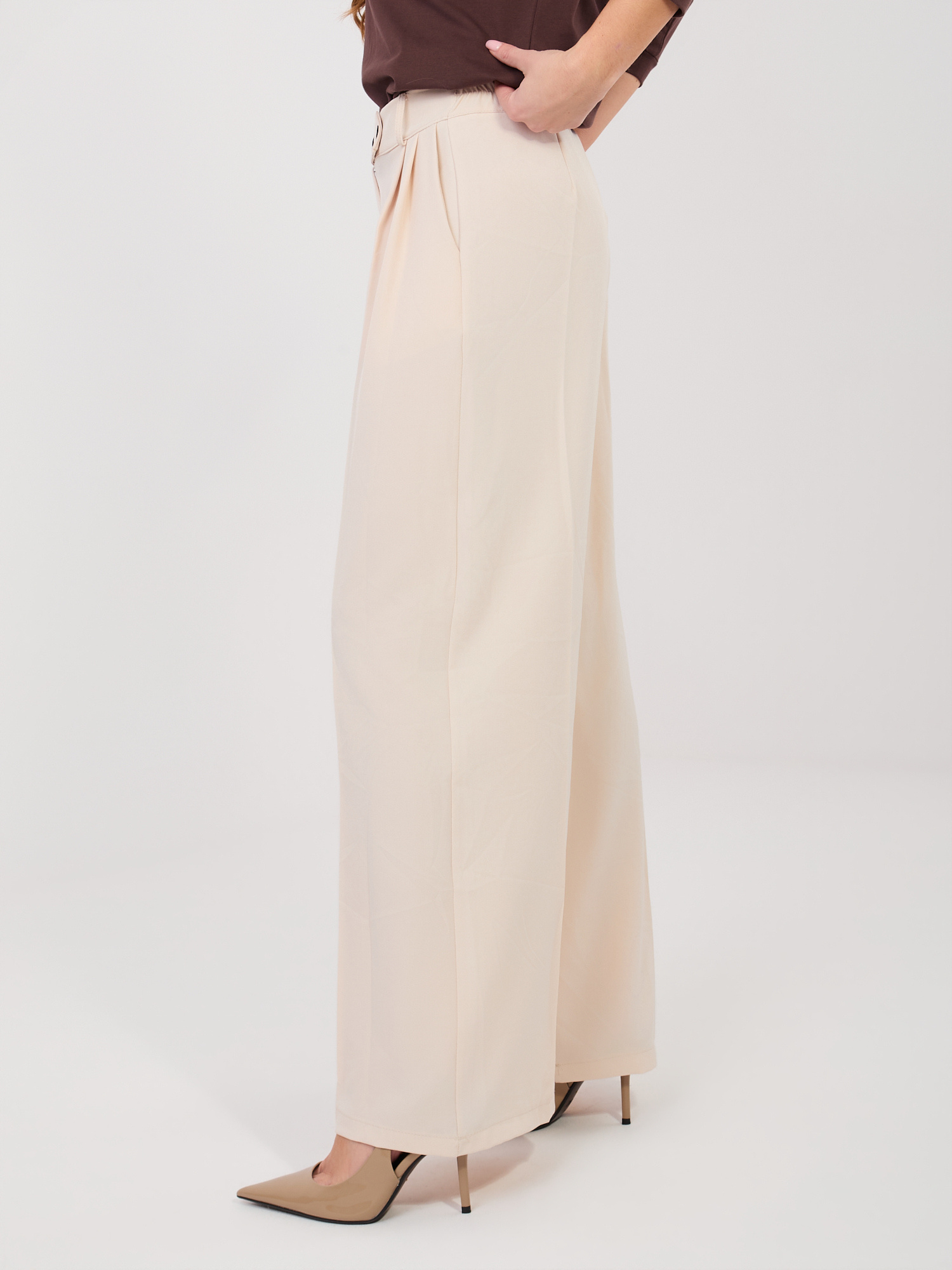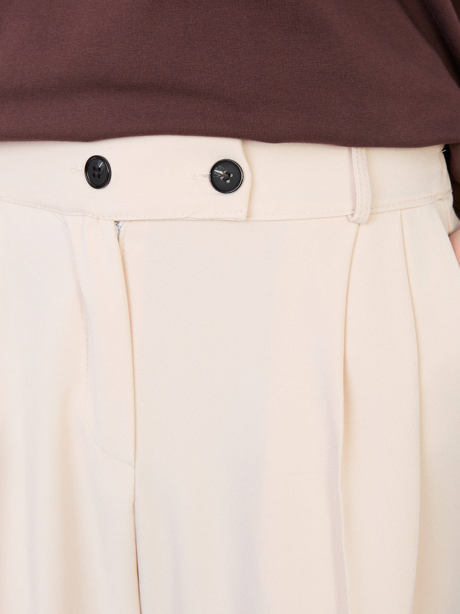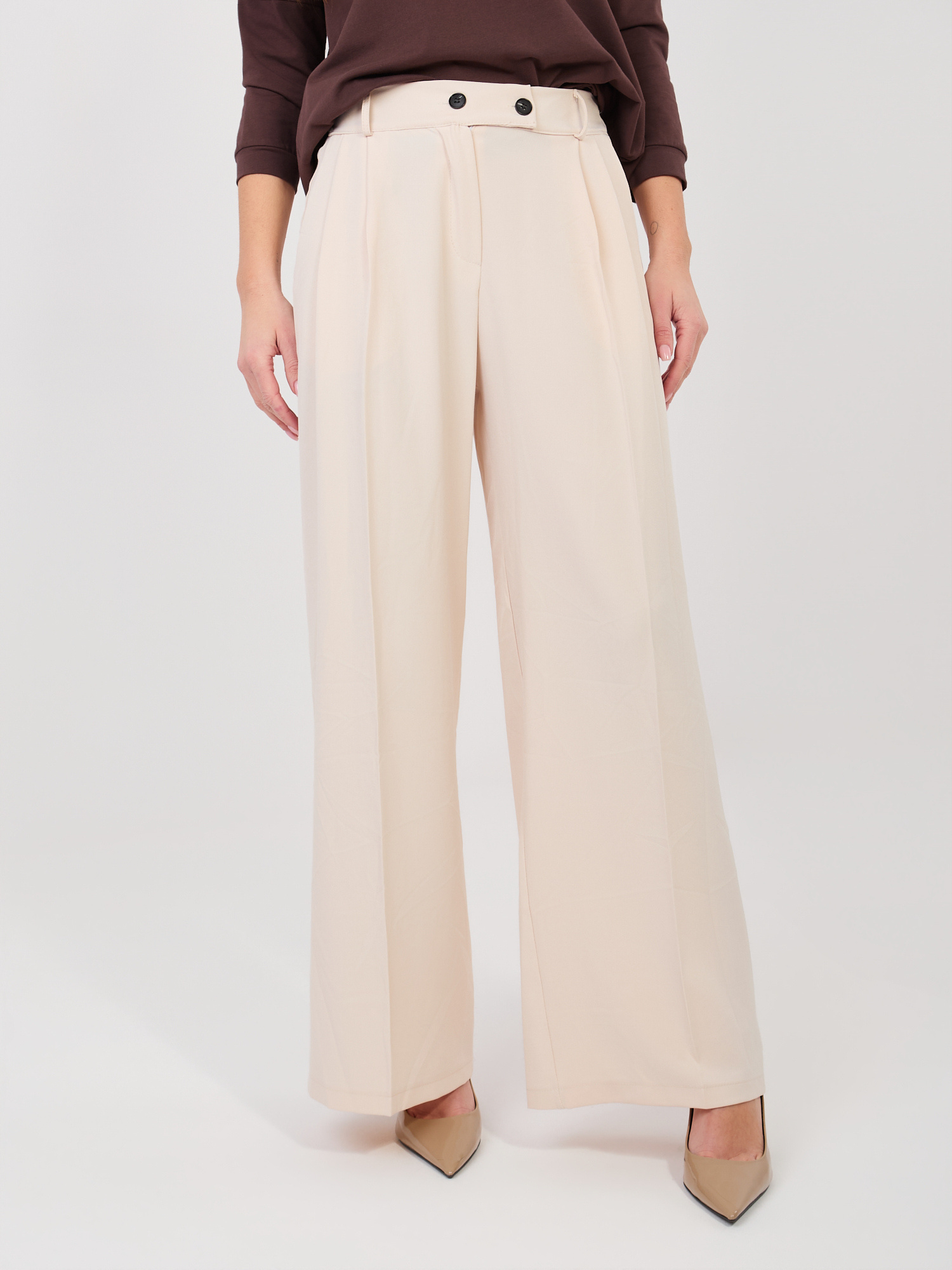 Az oldalzsebek praktikusak, a cipzáras és gombos záródás pedig stabil illeszkedést biztosít. A hosszú, bő szár elegáns esést ad a nadrágnak, így blúzzal, inggel vagy blézerrel kombinálva kifinomult összhatást teremt.