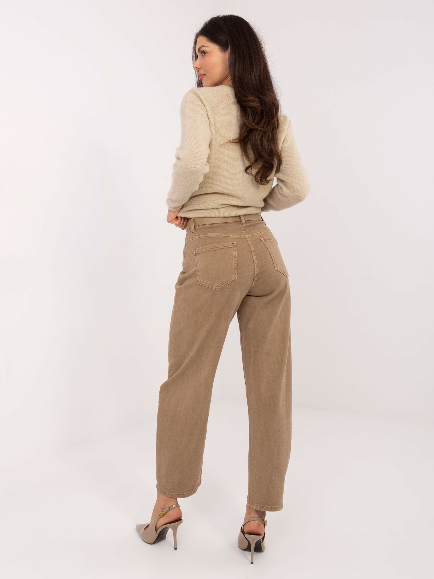 A farmer puha, rugalmas pamut–elasztán keverékből készült, amely jól alkalmazkodik a mozgáshoz, miközben megtartja az anyag formáját. A cipzáras–gombos záródás biztos tartást ad, a klasszikus zsebek pedig nemcsak praktikusak, hanem a nadrág jellegét is erősítik. A derékpánton található öv a nőies sziluett kiemelését szolgálja, így még harmonikusabbá teszi az összhatást.