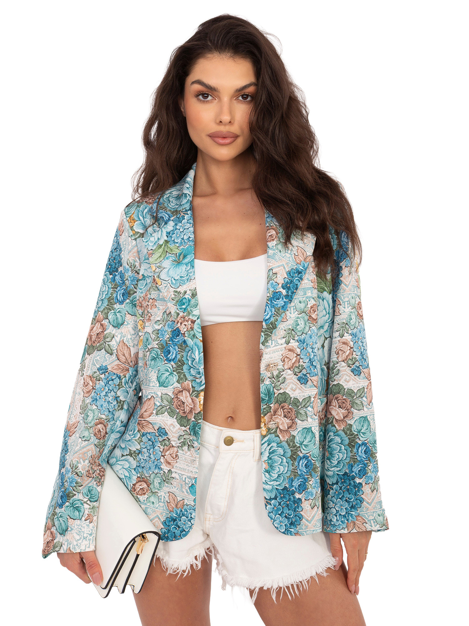 Az Italy Moda virágmintás blézere finom nőiességet és friss eleganciát visz a megjelenésedbe. A klasszikus, egysoros gombolású kialakítás letisztult alapot ad, amelyet a virágos minta tesz igazán különlegessé és stílusossá. A béléssel készült darab szépen tartja formáját, miközben kényelmes viseletet biztosít egész nap. A standard hossz és a hosszú ujjú fazon sokoldalúan kombinálható, így könnyedén beilleszthető akár elegánsabb, akár hétköznapi összeállításokba is.