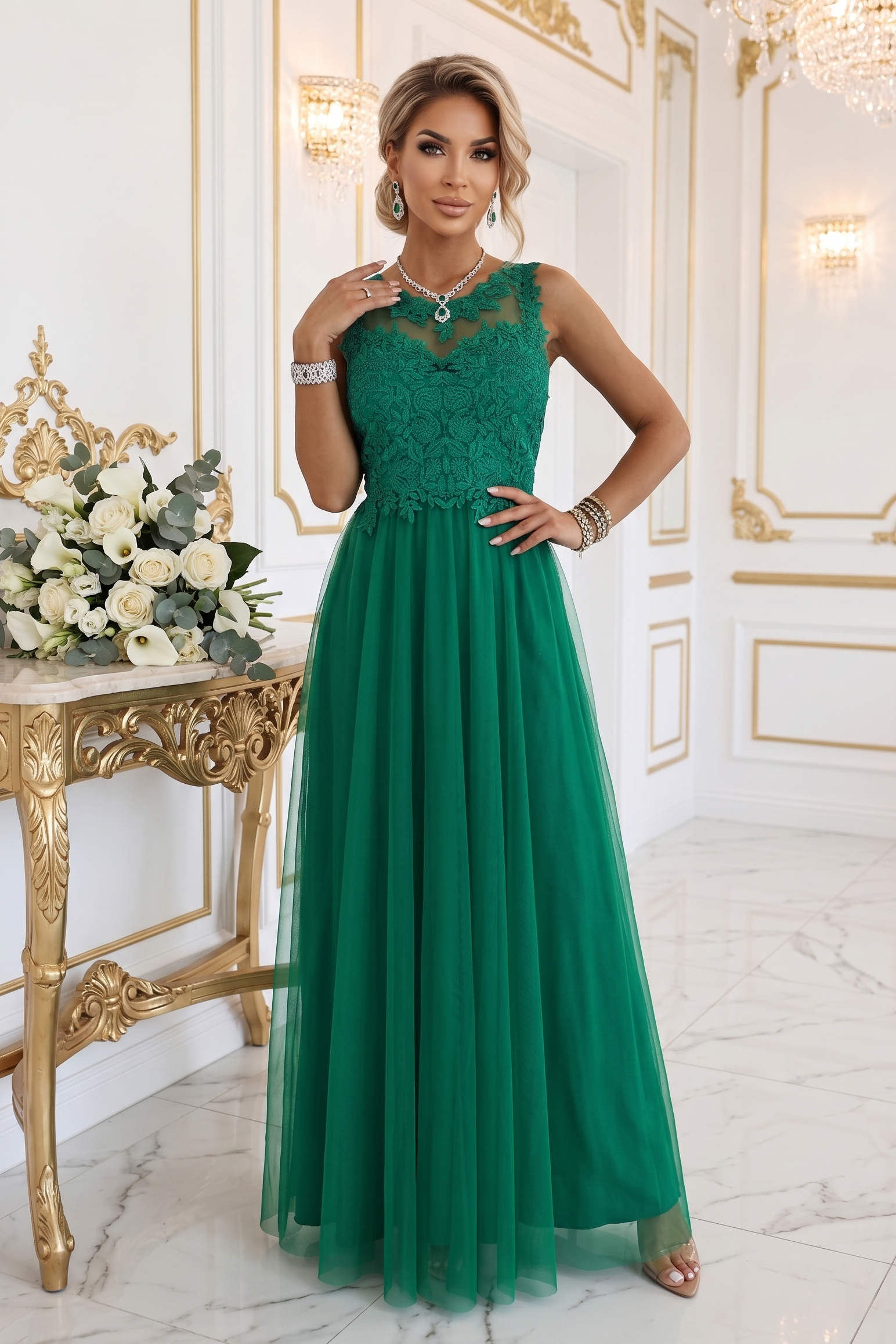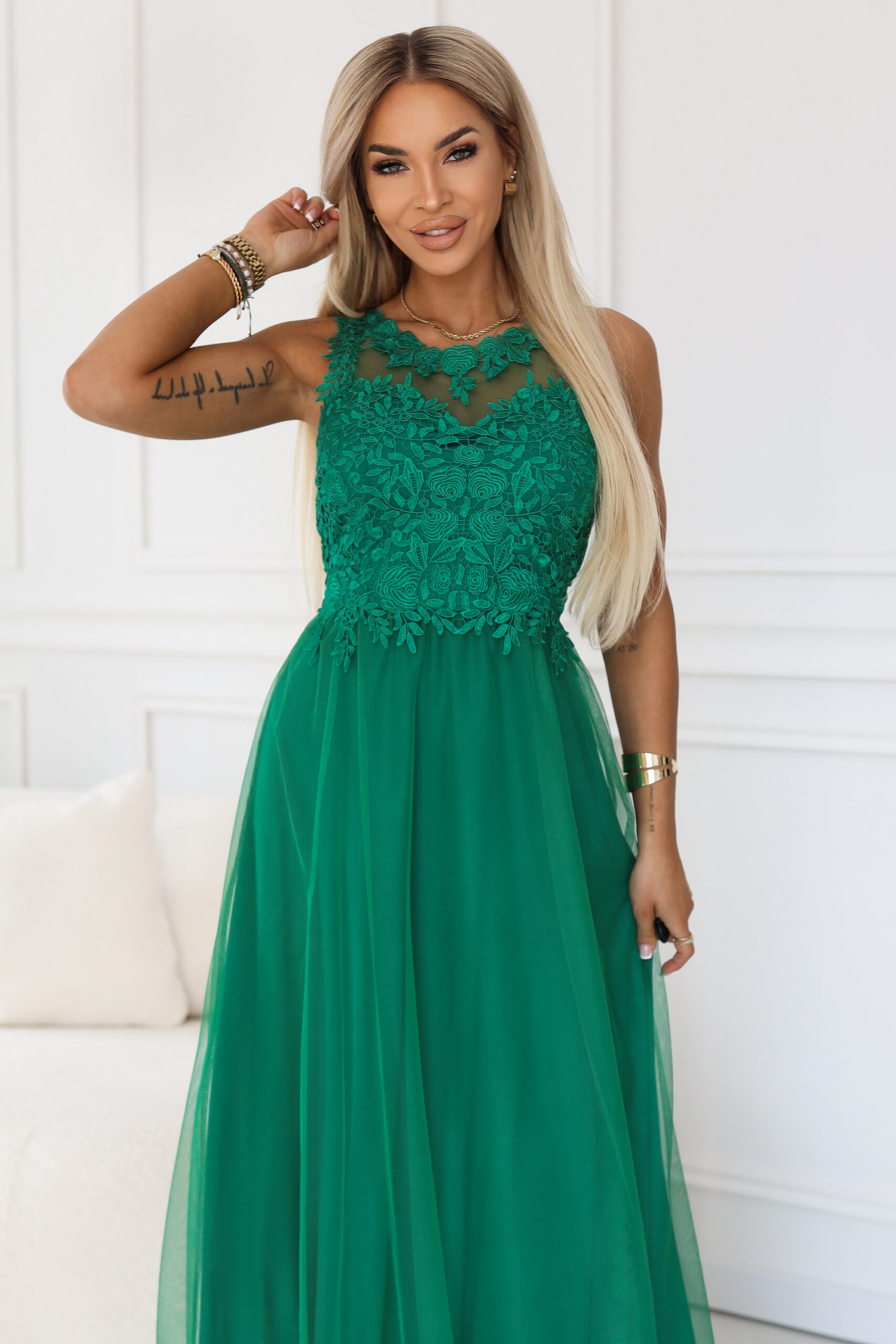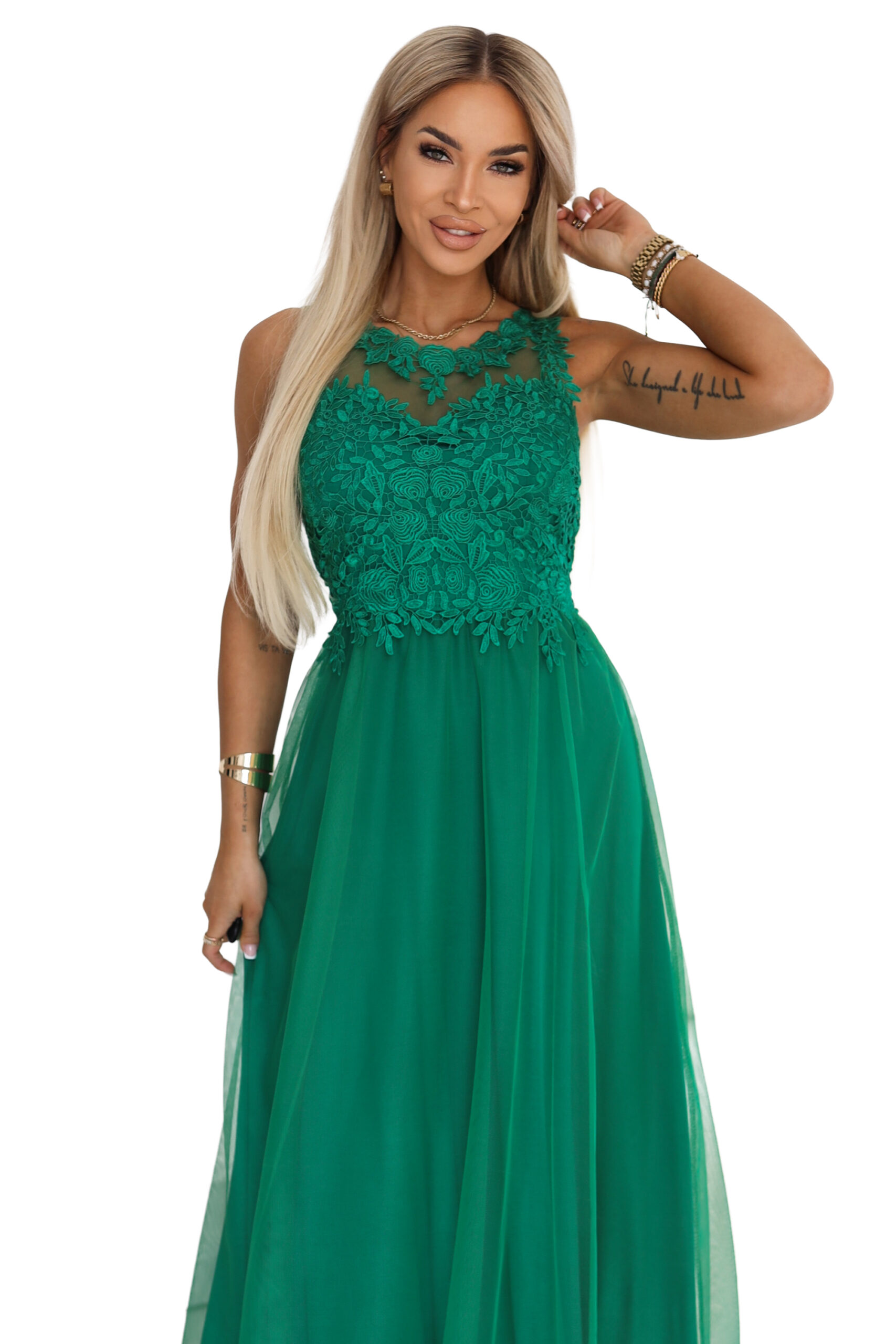 Ez a Numoco maxi ruha romantikus eleganciát és finom nőiességet sugároz, amely tökéletes választás különleges alkalmakra. A lágyan eső tüll szoknyarész légies mozgást biztosít, miközben könnyed, kifinomult megjelenést ad. A csipkével díszített felsőrész gondosan kidolgozott részletei elegáns karaktert kölcsönöznek, a finoman áttetsző betét pedig különleges, mégis visszafogott hatást teremt. A testhez simuló felsőrész szépen kiemeli a sziluettet, a hátrészen kialakított kivágás és csipkés részlet pedig nőies, látványos megoldás.