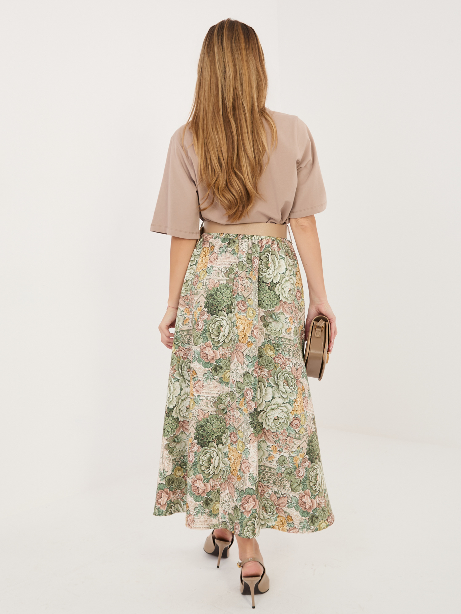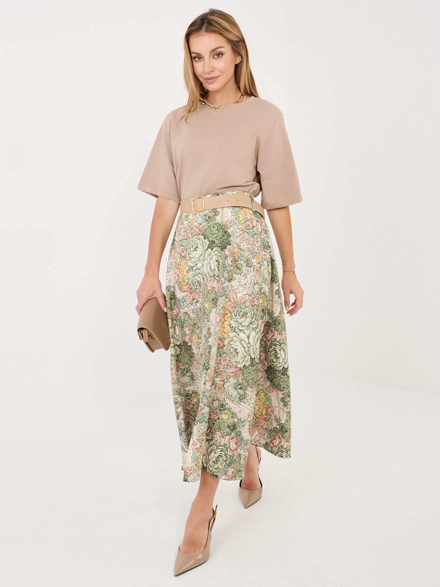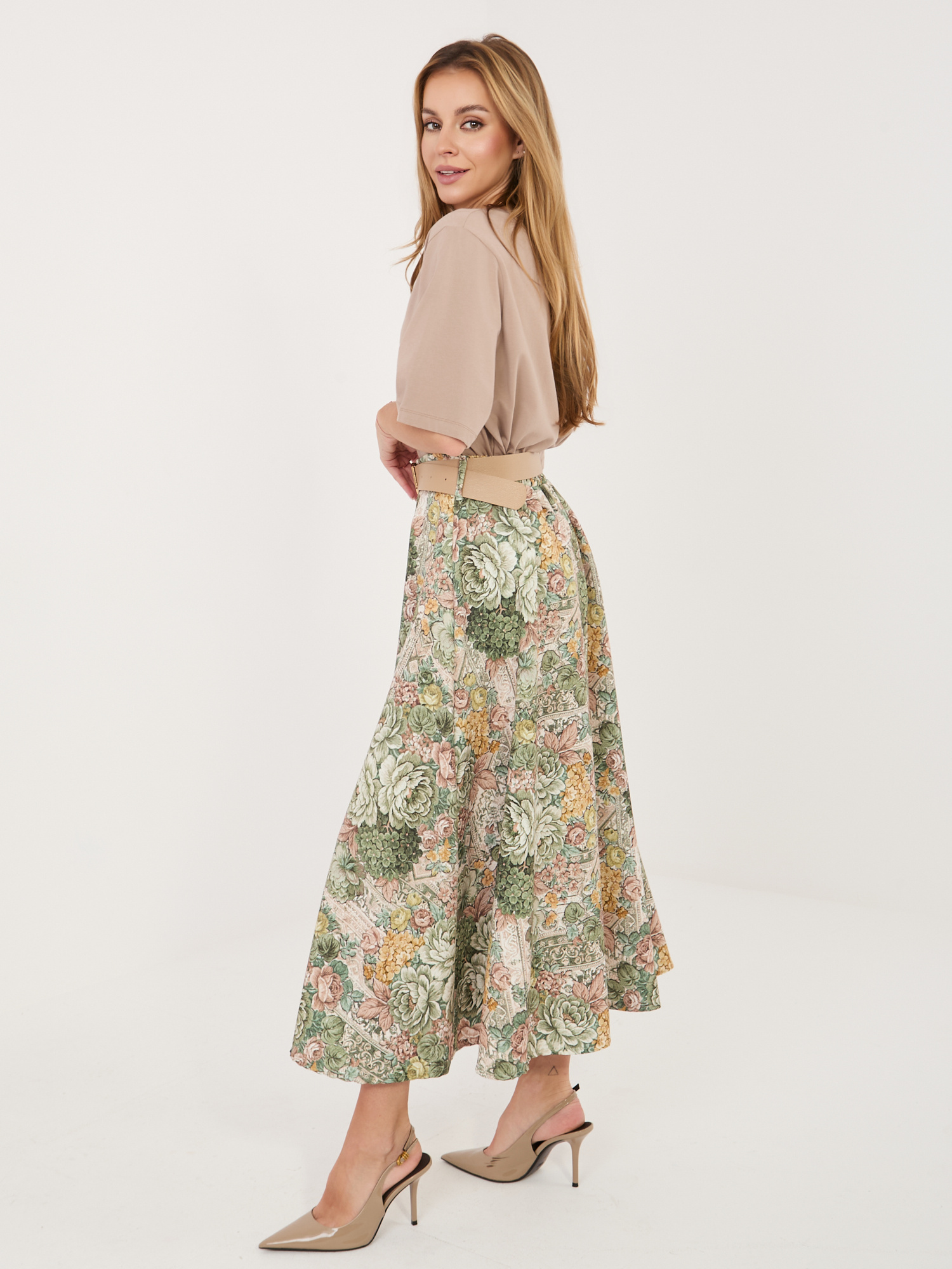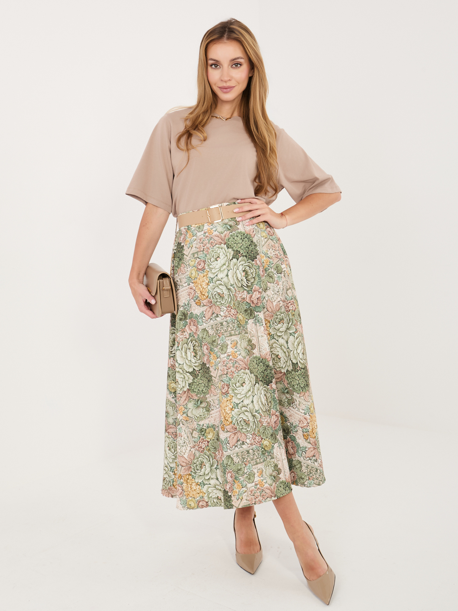 Az Italy Moda virágmintás midi szoknya könnyed nőiességet és elegáns megjelenést visz a mindennapokba. A lágy esésű anyag szépen követi a mozdulatokat, miközben a virágos minta finom, romantikus hangulatot teremt. A derékrészen elhelyezett öv segít kiemelni a sziluettet, így a szoknya egyszerre kényelmes és alakformáló hatású. Hosszának köszönhetően ideális választás munkahelyi megjelenéshez, alkalmi eseményekre vagy akár egy hétköznapi, mégis stílusos összeállításhoz is.
